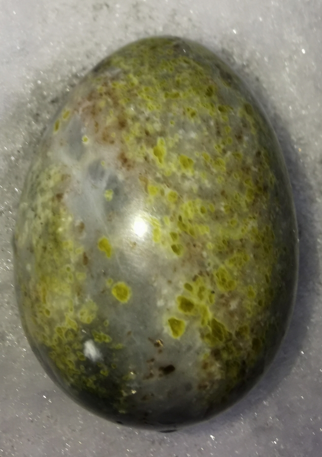 dies hier ist ein wishstone aus connemara marmor. ich habe ihn extra mal auf grauem karton links und weissem papiertuch rechts fotografiert, damit man sieht was das aussmacht. die camera macht das weiß grau und auch der stein wird dadurch ne spur dunkler. deswegen sind oft steine besser auf grau zu fotografieren. da schafft das cameraauge die farben besser.