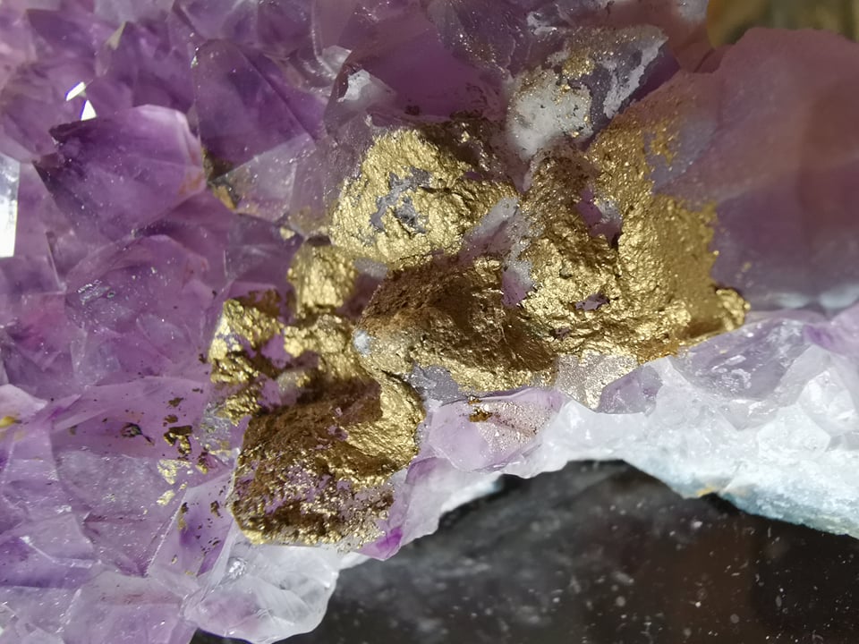 Hier mal zwei Amethysten von mir. Zugleich mit einer Frage. Besteht die Möglichkeit das sich echtes gold auf dem Amethyst befindet oder ist es "nur" Pyrit?