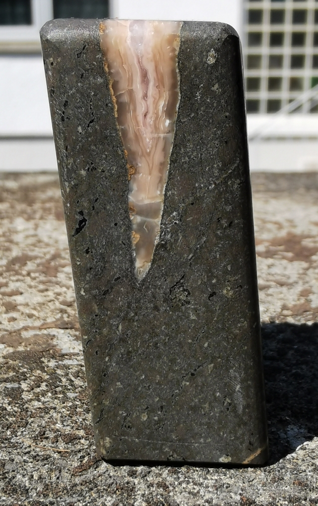 Die Kanten will ich abrunden und lediglich die Stellfläche bleibt eckig. Das der Achat so im Stein steckt, gefällt mir sehr gut!