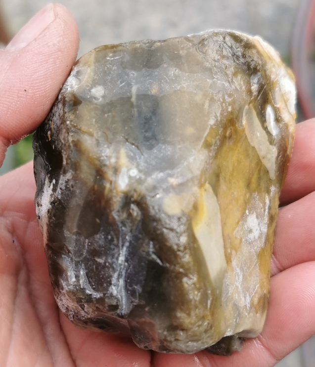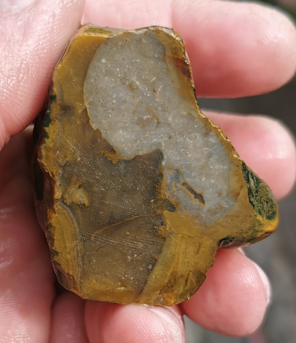 Ich habe auch gelbe Feuersteine und ging immer davon aus, dass sie durchgängig gelb sind, was scheint's nicht der Fall sein muss. Einen rötlichen habe ich, da kann man das von außen ahnen, denn das sieht nach Kruste aus, die den Stein nicht durchgängig überzieht.