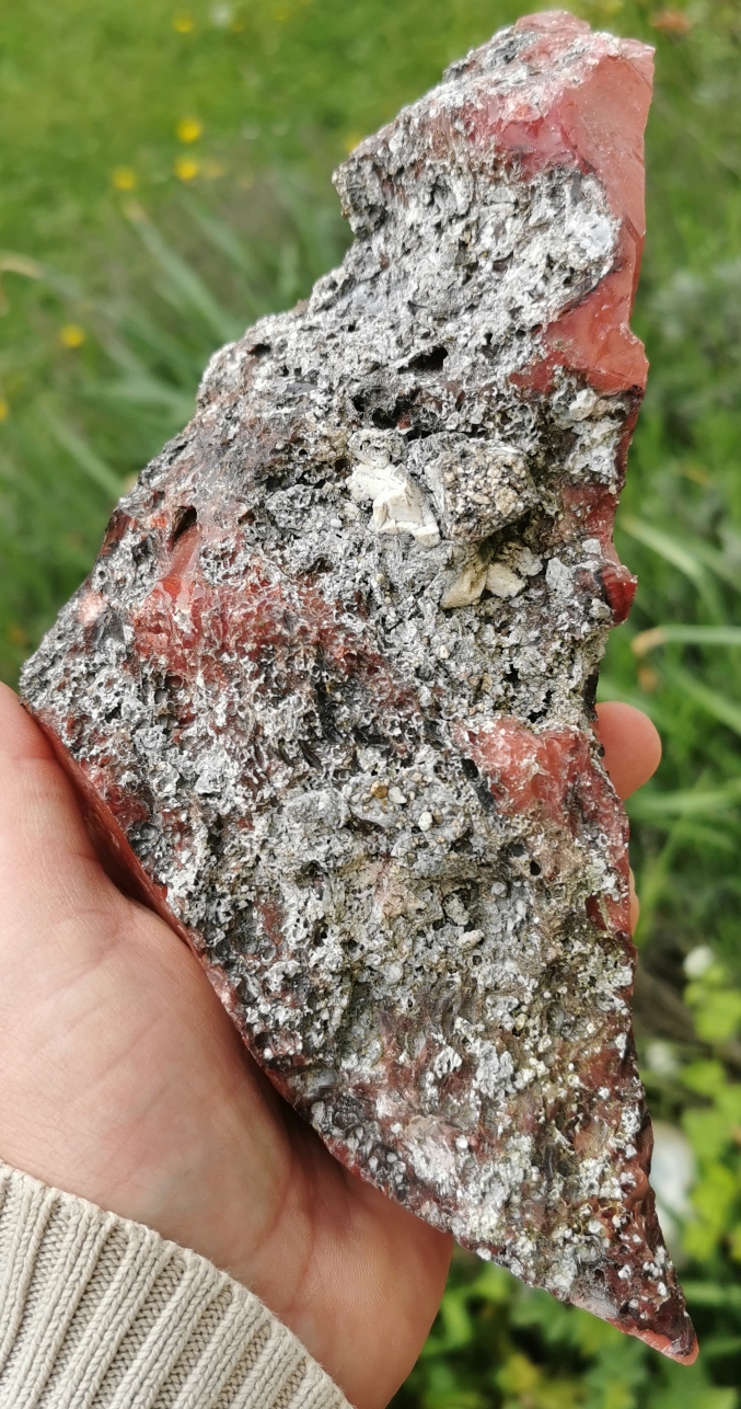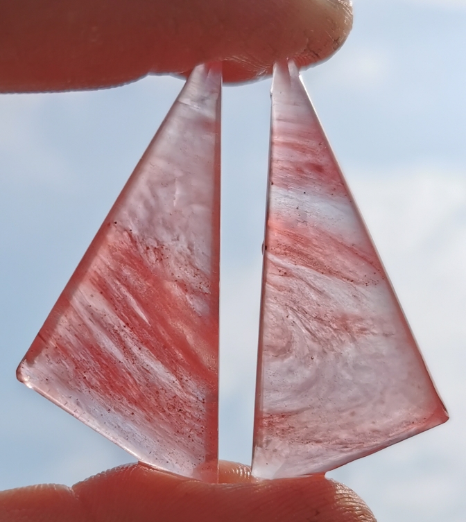 Die Außenseite hat eine Grau his Schwarze Außenhaut. Das durchsichtige Material hat im inneren rote Schlieren, Striche und ein wolkiges Aussehen. Dieses Stück ist keilförmig, weshalb der untere Bereich sehr dick und nicht ganz durchscheinend ist. Dünn geschnitten kann man sehr schön die Musterung sehn.