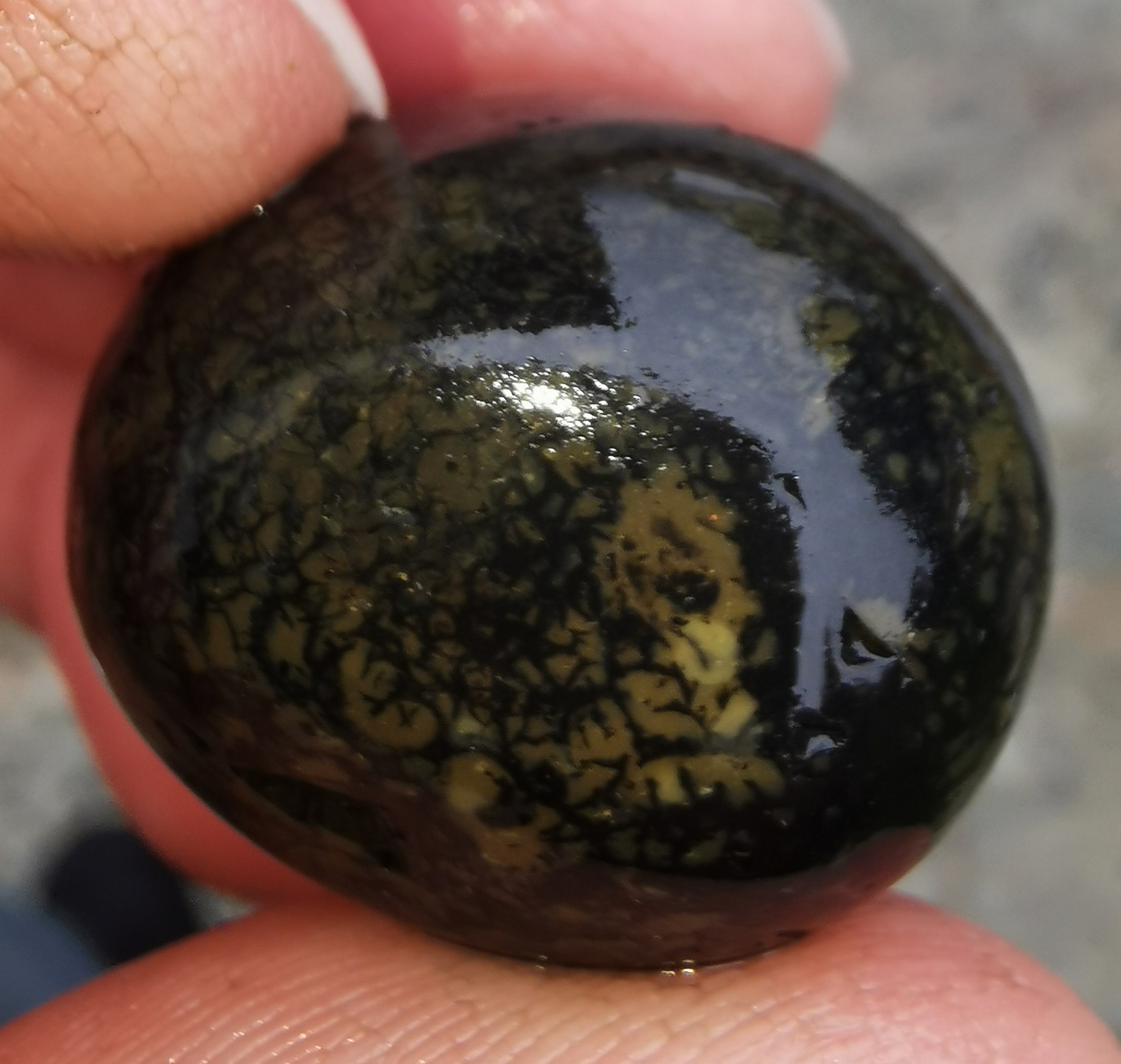 Ich habe hier ein echtes Überraschungsei in meiner Trommel gehabt. Es war ursprünglich ein schwarzer Stein, den ich aufgrund seiner kugeligen Form vom Strand einmal mitgenommen hatte. Gedacht war er als reiner Handschmeichler.