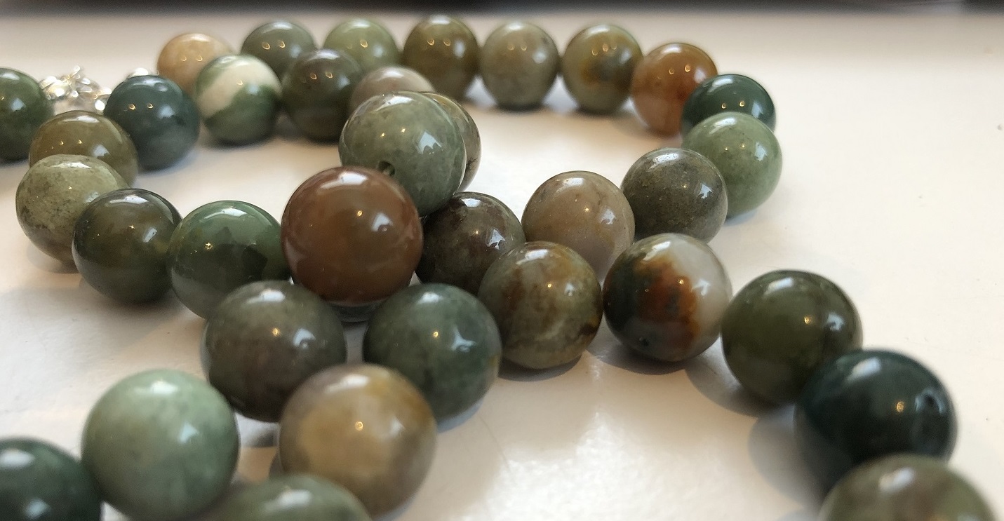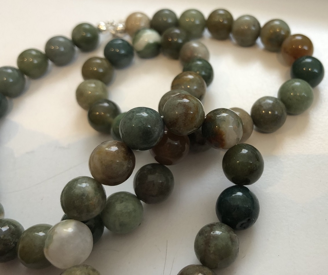 Ich suchte eine Heliotrop-Kette. Leider war sie bei unserem Shop nicht vorrätig, also habe ich sie so im Internet bestellt. Nun bin ich hin und her gerissen. Für mich sieht das nicht nach Heliotrop, sondern ehr nach Moosachat aus. Wie seht Ihr das?