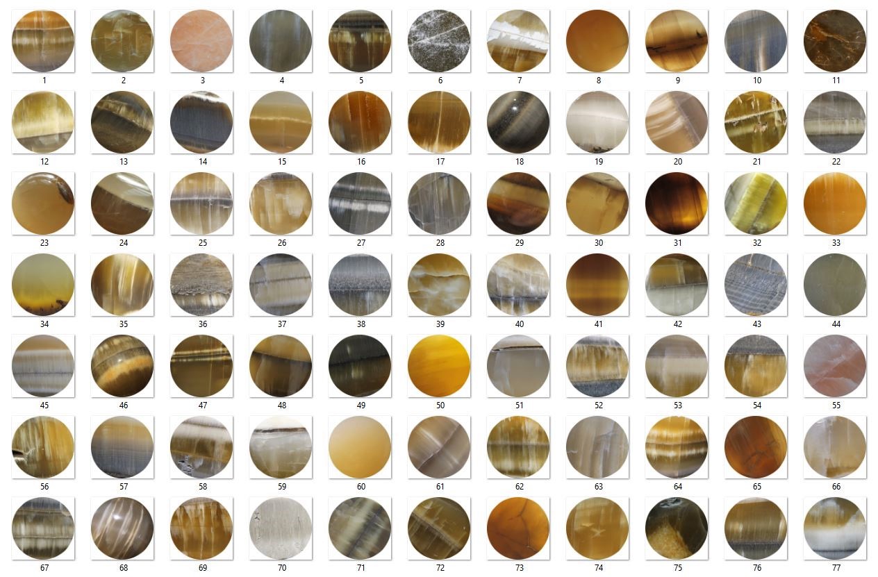 Es gibt etliche unterschiedliche Strukturen. Die Farbpalette reicht von grau, gelb, grün zu braun. Seltene Stücke haben eine rosane Färbung.
