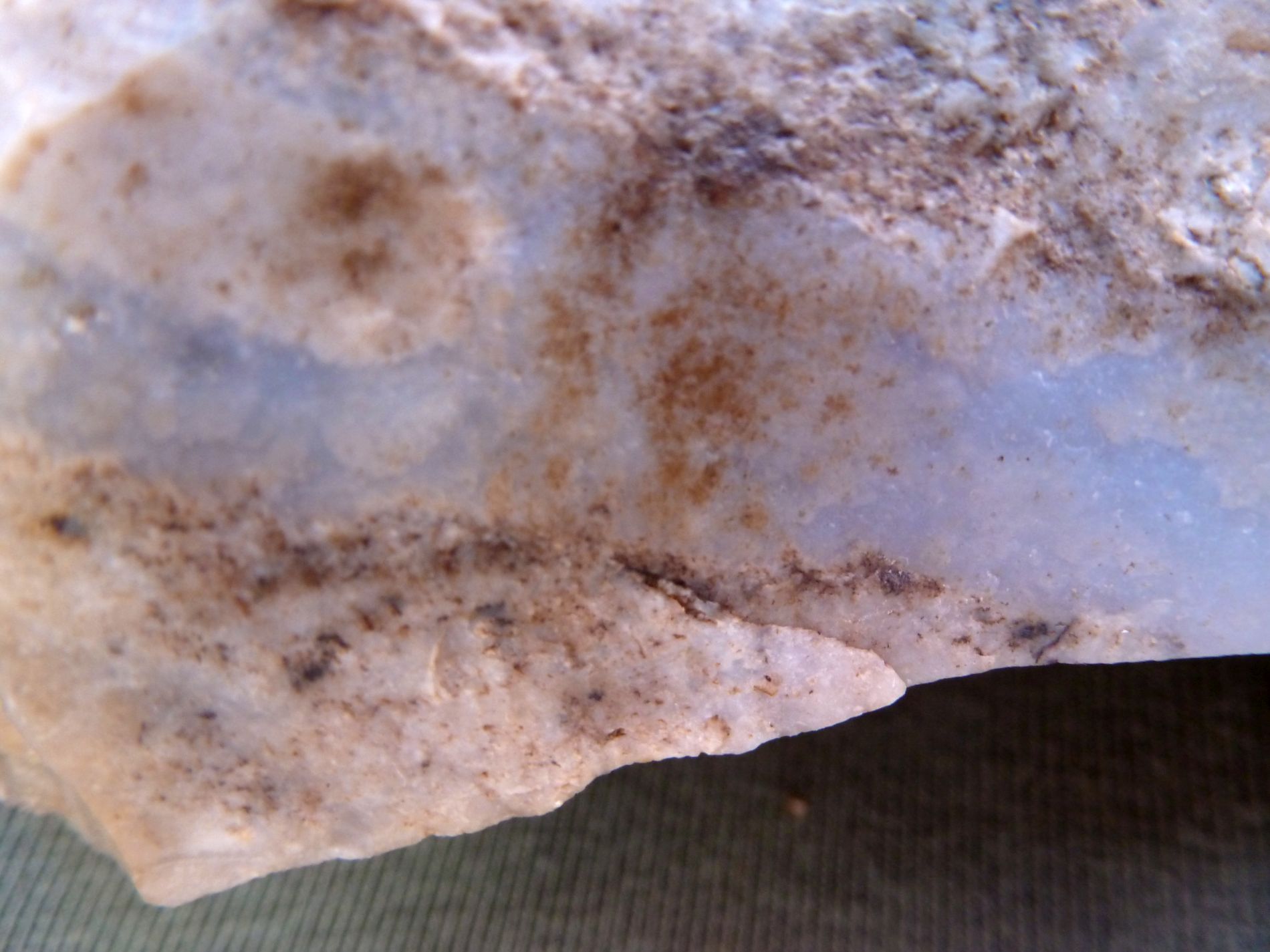 Ich vermute, das Blaue ist Chalcedon. Teilweise ist da so was schwarzes, was vielleich Dendriten sein könnten. Ich habe das zuerst für Schmutz gehalten, läßt sich aber nicht abkratzen.