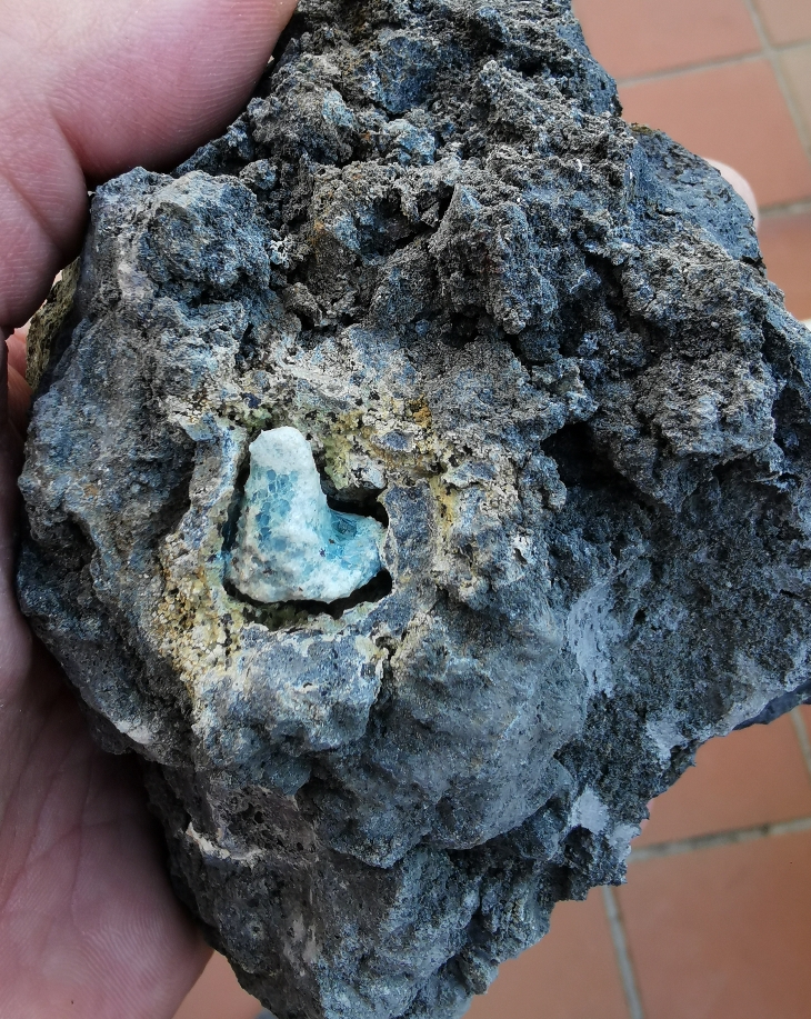 Was jedoch sehr schnell klar wurde, um den gläsernen Quarz ist sehr häufig ein gelblich grüner Bereich, der den Quarz umschließt. Manchmal ist dieser komplett eingeschlossen und dadurch auch nicht zu bergen aber häufig ist er nur halb oder an einer kleinen Stelle mit dem außenliegenden Gestein verbunden. Wenn man dann noch Glück hat, ist der freiliegende bereich schön mit einer Glasschicht überzogen, der von grün, über Türkise, bis tief Blau geht. Da wir hier schon früh am Morgen angekommen waren, war es von den Temperaturen noch recht angenehm, jedoch haben wir beschlossen, aus Temperatur und Sicherheitsgründen (ich hatte leider meinen Schutzhelm vergessen), am Rande des Steinbruchs und in der obersten Schicht zu suchen.