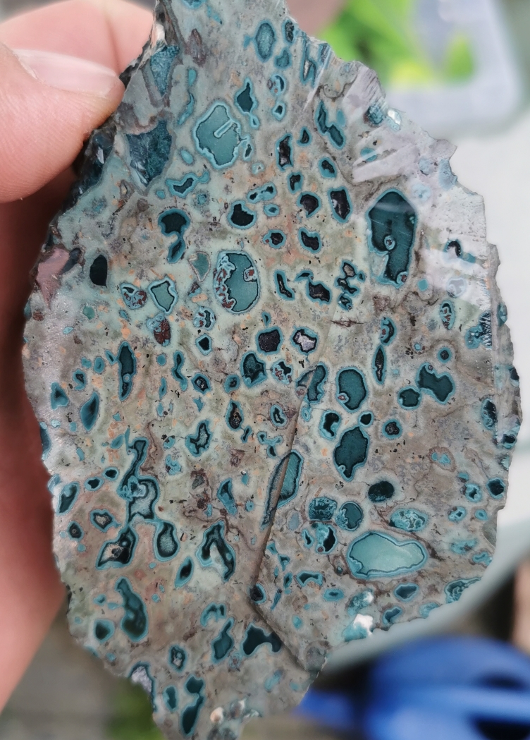 Türkis/Grauer Rhyolith mit Calcit gefüllten Achathüllen. Die Achathüllen sind teilweise unter 1 mm dünn.