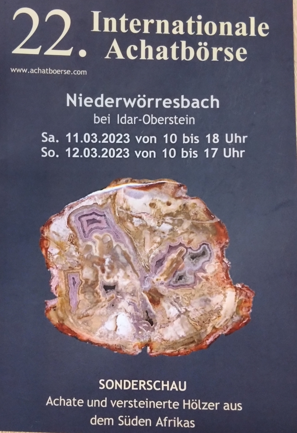 Begleitend zur Börse gibt es eine Sonderausstellung „Achate und versteinerte Hölzer aus dem Süden Afrikas“, außerdem finden am Samstag ab 18.30Uhr Fachvorträge statt.