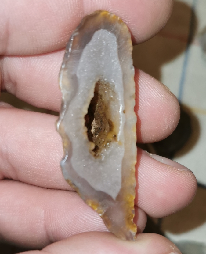 Was mich jedoch viel mehr erfreute war ein einheimischer Achat, der nicht als "Müll" hier landete. Sowohl oben, wie auch unten besitzt er eine hauchdünne Achat Schicht und in der Mitte ist dieser mit Quaz gefüllt.