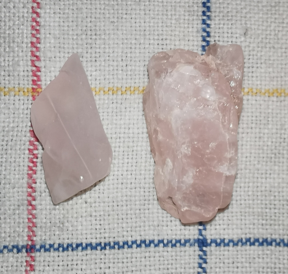 Leider schlecht zu erkennen. Hier gleich zwei Stück nebeneinander. Links Bergkristall und rechts Rosenquarz