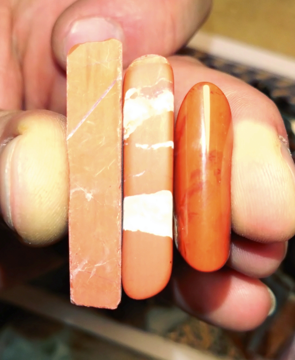 Roter Jaspis, unterschied der Kanten<br /><br />Links: Rohling<br />Mitte: getrommelt (noch nicht poliert)<br />Rechts: per Hand bearbeitet