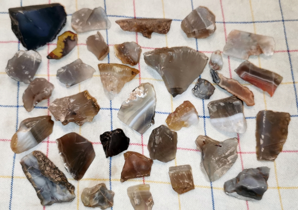 Als erstes zeige ich euch hier die Achatstücke, die als Müll dort entsorgt wurden. Wer weiß, wie häufig der Pflug diese schon beschädigt hat, weshalb es teilweise auch nur Splitter sind.