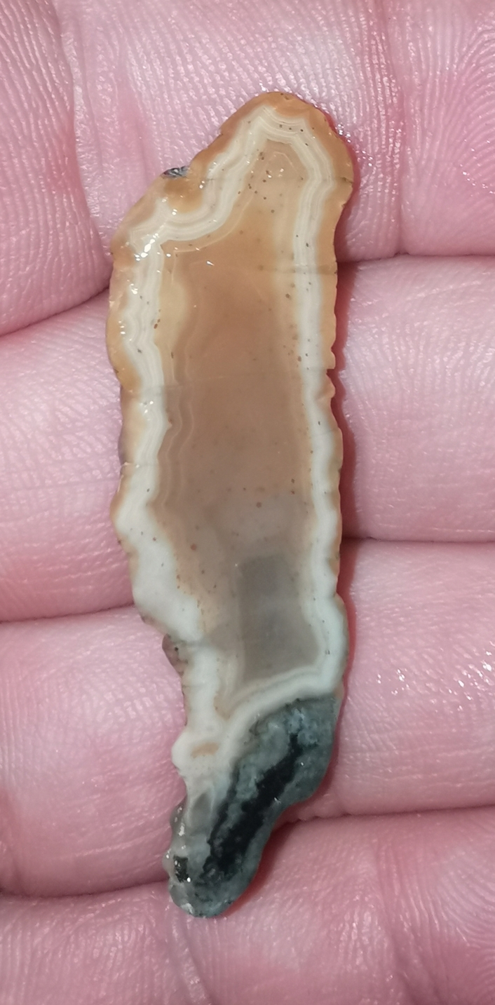 Dieses kleine Achat Stück ist noch nicht vom Pflug zerstört worden. Es handelt sich dabei um ein äußeres Stück eines größeren Achates. Die hier zu sehende Oberseite ist die Schnittfläche.