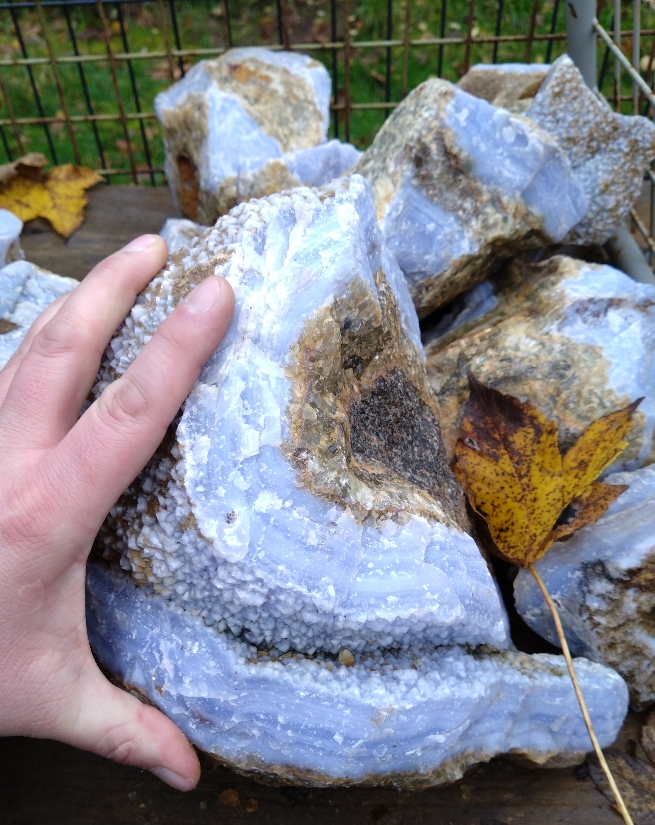 Zwei schöne blaue Lagencalzedone in beeindruckender größe, die ich sehr gerne mitgenommen hätte. Vom Gewicht her ist der erste gut 5 kg und der zweite gut 10 kg schwer.