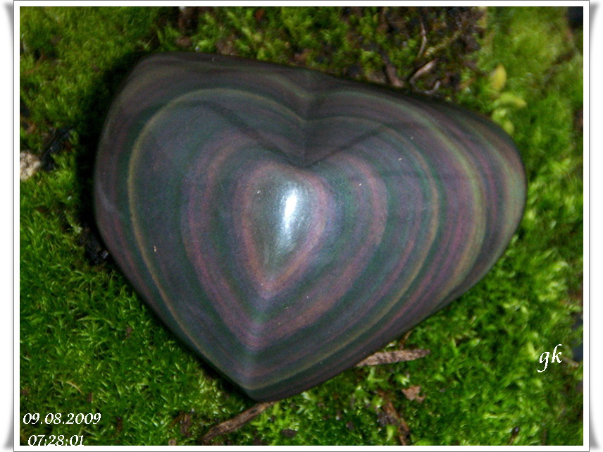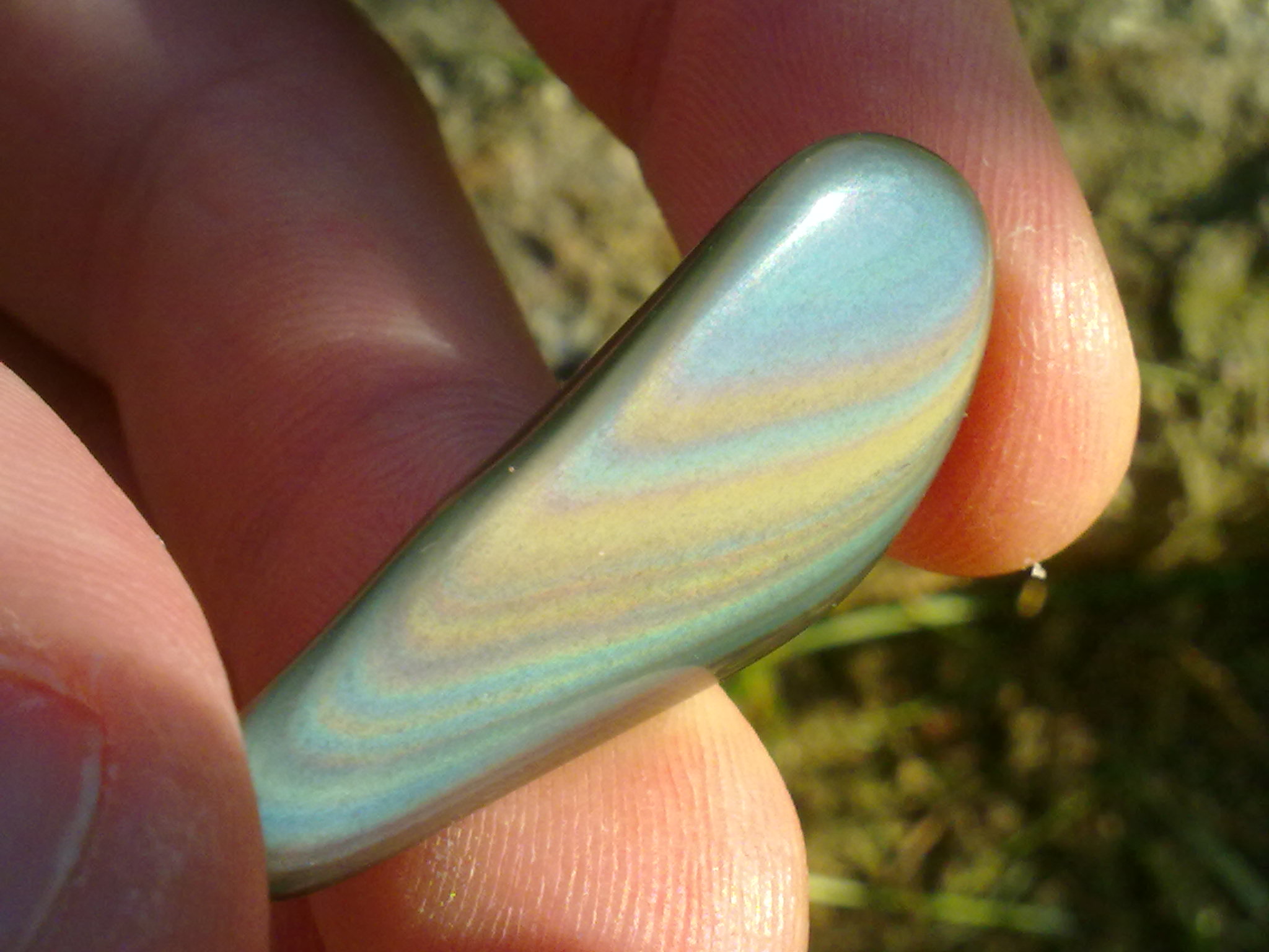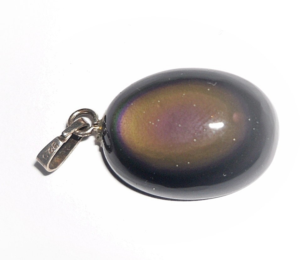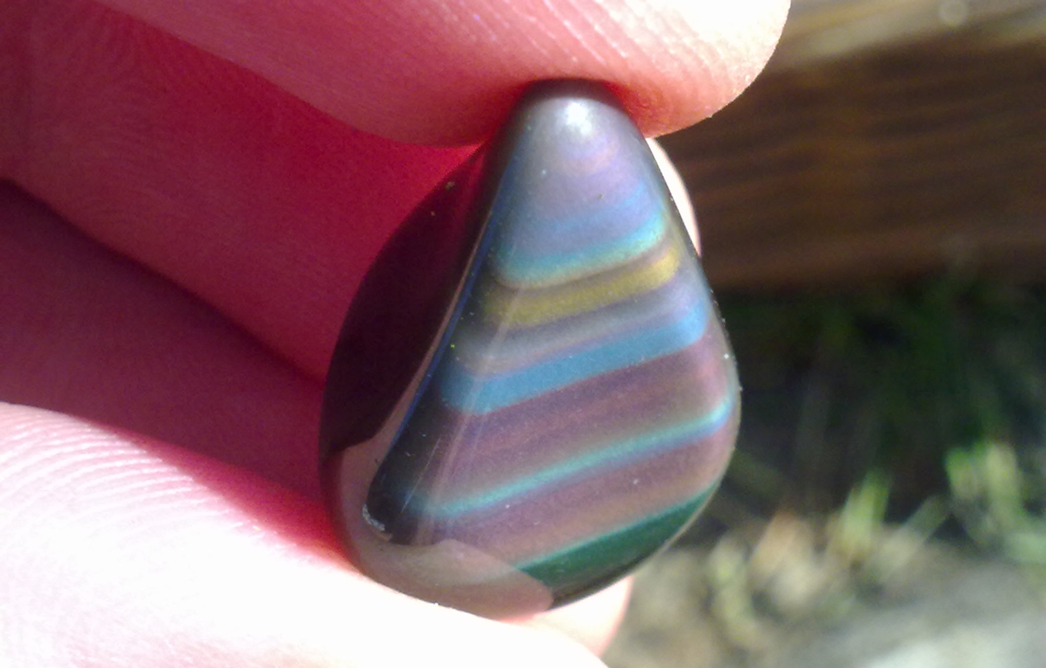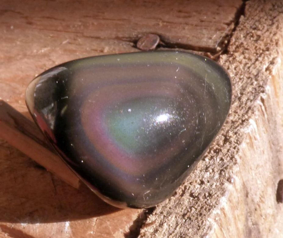 Mein Regenbogenobsidian, der wie ein Obsidianspiegel geschliffen ist.