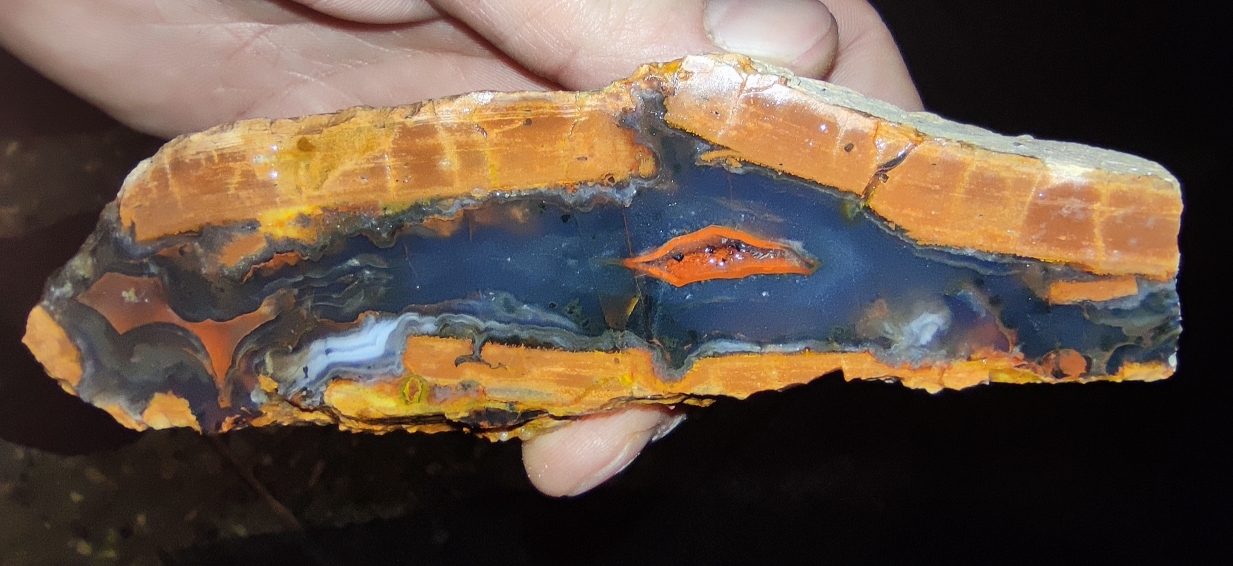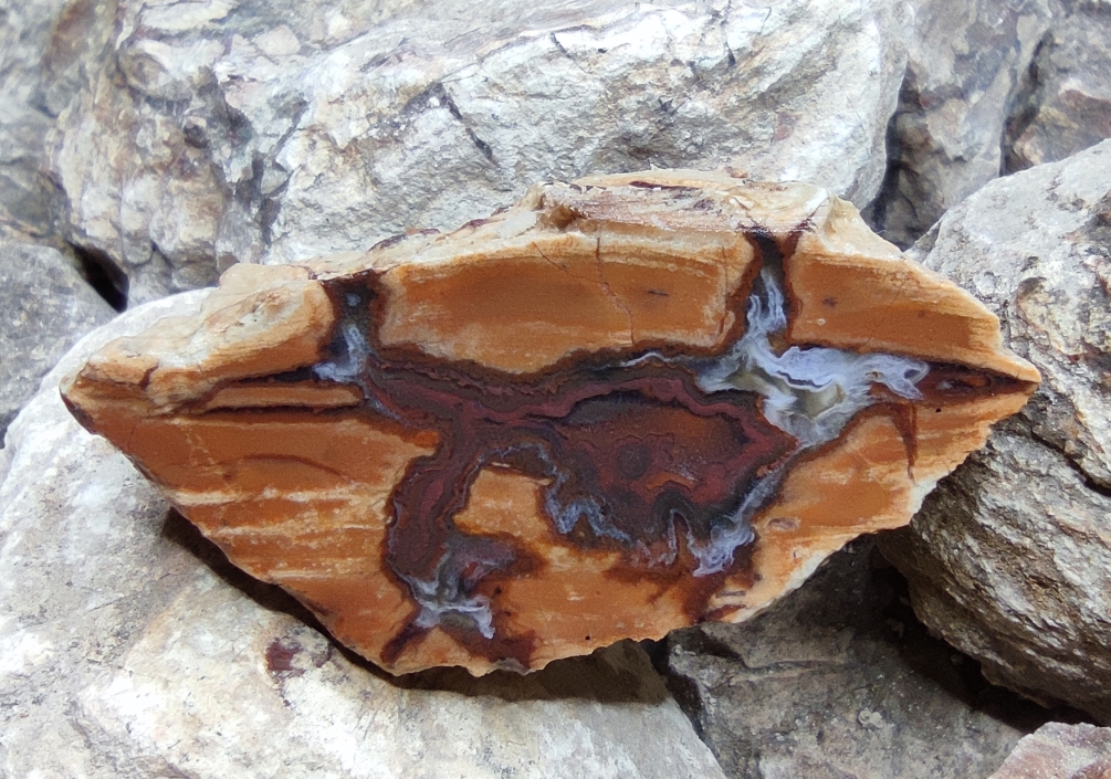 Der Rhyolith Achat, von der sehr kleinen Fundstelle, hat eine starke Brekzienstruktur und ist überwiegend rot/braun gefärbt.