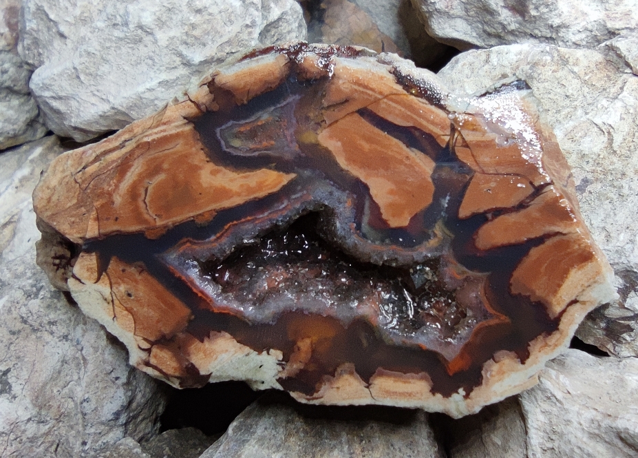 Es kommen vereinzelt auch mit Quarz gefüllte Stücke zum Vorschein. Dieses ist noch in Bearbeitung und deswegen noch nicht poliert.