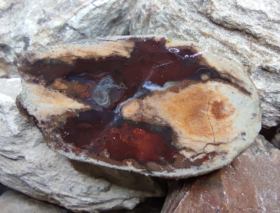 Um aus den Stücken Anhänger zu schleifen, schneide ich manche auch horizontal auf, was für den Stein eigentlich ganz verkehrt ist. Dafür sind die Anhänger dann umso schöner. Was ich sehr mag, wenn man durch den Achat auf das Muttergestein sehen kann. Hier mal ein Beispiel, der besonders klar ist.