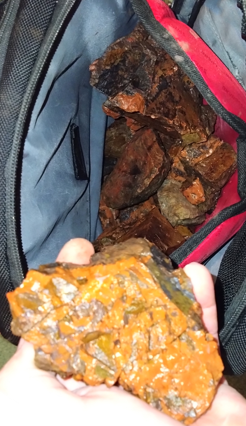 Somit fasste ich den Beschluss, zumindest ein wenig von diesem mitzunehmen und so versuchte ich ein möglichst großes Stück herauszuschlagen. Der Stein war jedoch um einiges härter als gedacht und durch die Anstrengung der letzten Stunde hatte ich nicht einmal mehr richtig die Kraft, meinen 1,5 kg Fäustling immer und immer wieder auf den Meißel zu schlagen. Also musste ich mich auch mit kleineren Stücken zufrieden geben und auf diese Weise habe ich doch kehr herausbekommen, als anfänglich gedacht. Ich habe eine Ahnung, wie viel es genau sind aber hier zumindest mal zwei Beispiele von seiner Schönheit.