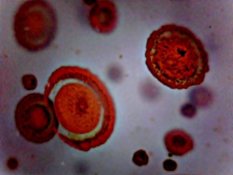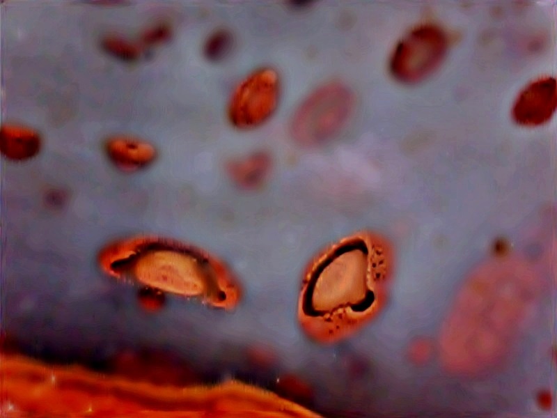 Ich habe nun wieder einmal eine große Achatmandel aus meiner Sammlung mit einem Mikroobjektiv abgetastet ´.Und wieder entdeckte ich solche seltsame Gebilde. Mit bloßem Auge