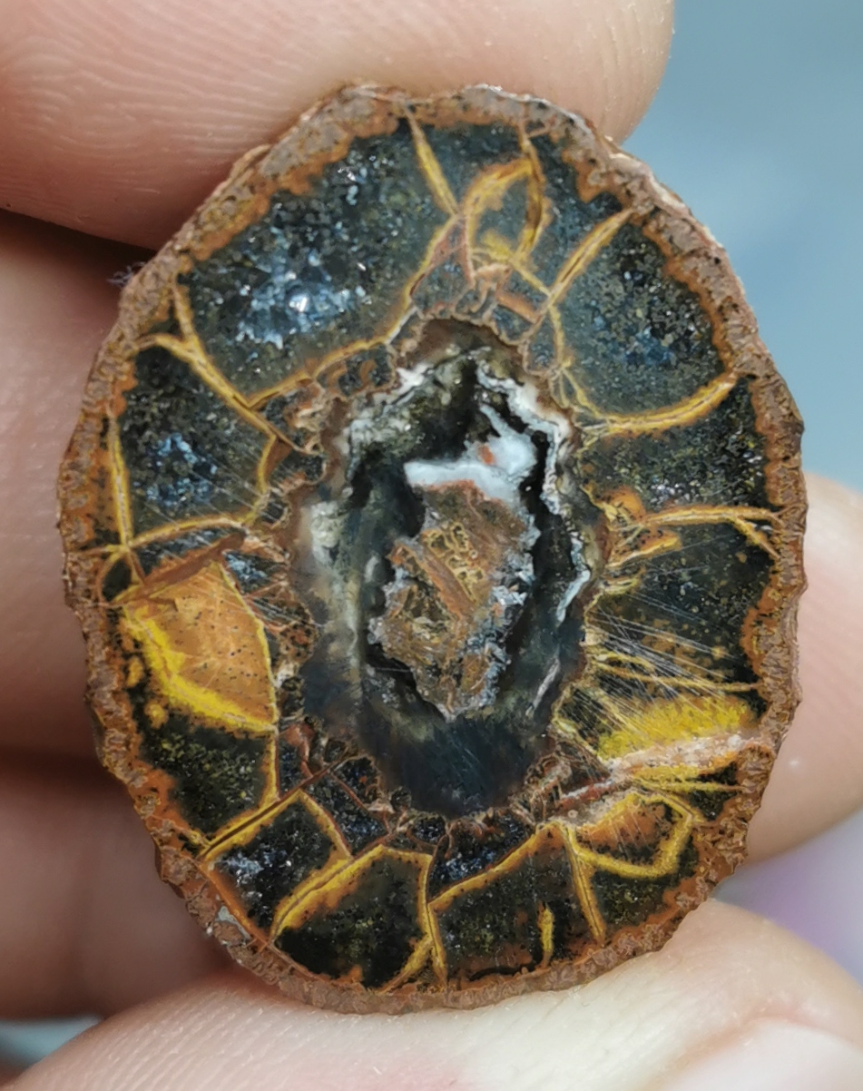 Der innere Kern sieht wie die Überreste eines Achats aus aber das gesamte Erscheinungsbild sieht nach einer Septarie aus, was alleine von dem Fundort ausgeschlossen werden kann.