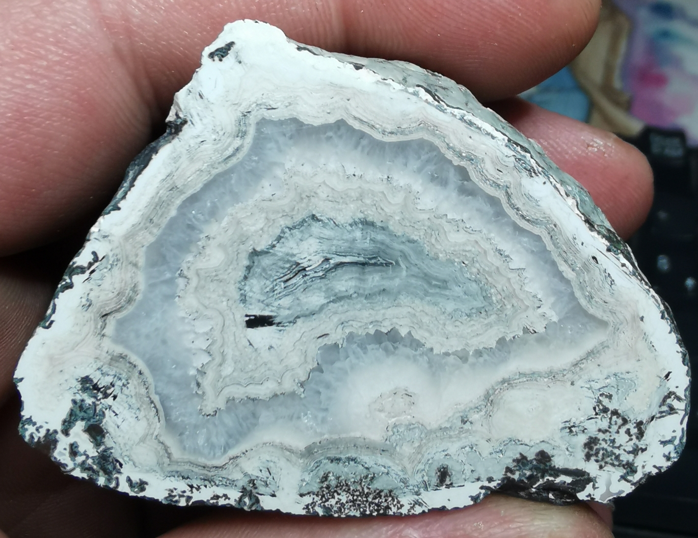 Ich habe mir gerade das Video angesehen und ich finde den 5. Stein, wo du eine zweite Scheibe abgeschnitten hast, sehr schön, weil da auch die ganzen Dendriten drin sind. Das gefällt mir besonders gut.