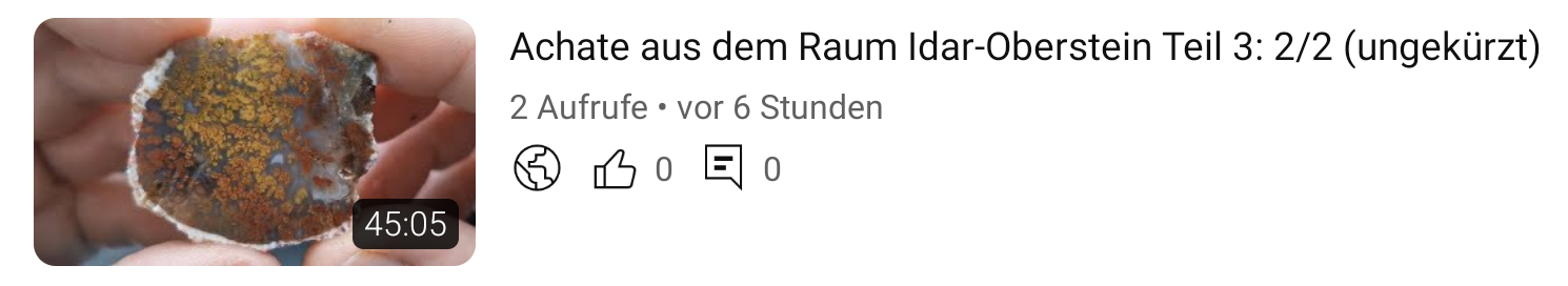 Naja, wir sind vor Jahrzehnten auch dort gewesen zum Sammeln und man sagte uns dass es kaum noch Achate gibt in der Gegend, weswegen auch die ganzen Schleifer in Brasilien oder Madagaskar einkaufen. Und die kippen eben den Abfall in die Gegend und Bäche. Ja es gibt ein paar ausgewählte stellen für Touristen, so einen Steinbruch z.b. wo wir auch Achatmandeln fanden und Eintritt bezahlen mussten, meist stehen die Stellen aber unter Naturschutz oder es gibt Nutzungsrechte sagte man uns.SteinEi Sammler hat geschrieben: 23.03.2023, 01:58Die Stücke von den drei Filmen sind (sofern ich nichts anderes gesagt habe) allesamt Originale aus der Gegend von Idar-Oberstein. Es sind definitiv keine Bereiche, wo "Abfälle" entsorgt wurden.Morgaine999 hat geschrieben: 22.03.2023, 22:47 wunderschön, aber die steine dort auf den Äckern sind ja auch nicht aus der Gegend......