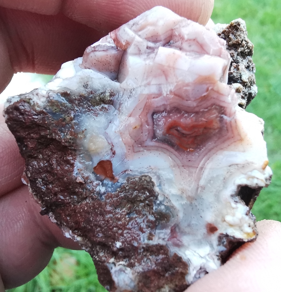 Daher machte ich mich ein paar Metern weiter unten wieder auf den Rückweg. Auf halber Strecke machte ich zwei weitere außergewöhnliche Funde. Zum einen einen schönen Achat, der noch im Muttergestein eingeschlossen ist