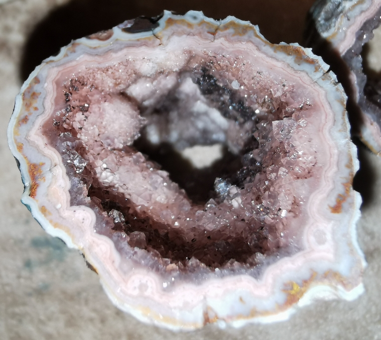 Kurze Zeit nach diesem Fund hatte ich das nächste Schmuckstück in der Hand. Zuerst sah es nach einer normalen Achat Mandel aus aber an einer Seite war diese hohl und es waren lauter Kristalle zu sehen. Zuhauses sah ich dann nach dem Reinigen, dass diese durchgehend hohl und voller Kristalle ist.