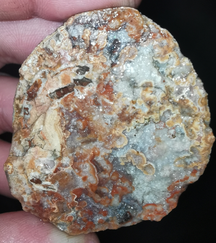 Kurze Zeit nach diesem Fund hatte ich das nächste Schmuckstück in der Hand. Zuerst sah es nach einer normalen Achat Mandel aus aber an einer Seite war diese hohl und es waren lauter Kristalle zu sehen. Zuhauses sah ich dann nach dem Reinigen, dass diese durchgehend hohl und voller Kristalle ist.