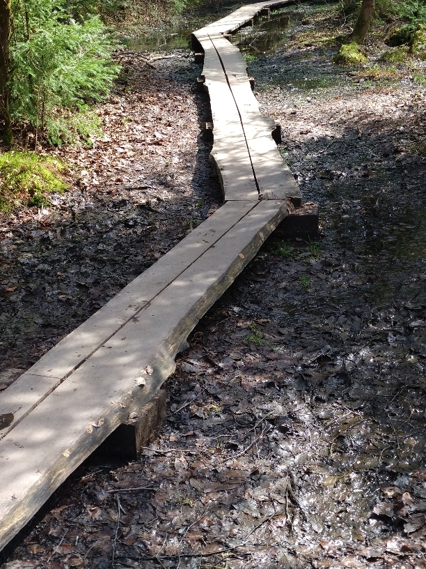 Im Anschluss haben wir noch einen Spaziergang im daneben liegenden Wald unternommen, welcher ebenfalls stellenweise nur über Stege zu bewältigen war. Auch wenn diese Bereich offiziell nicht mehr zum Moor gehörte, war der Boden doch sehr torflastig und ebenfalls sehr sumpfig, so dass man den Weg nicht verlassen sollte.
