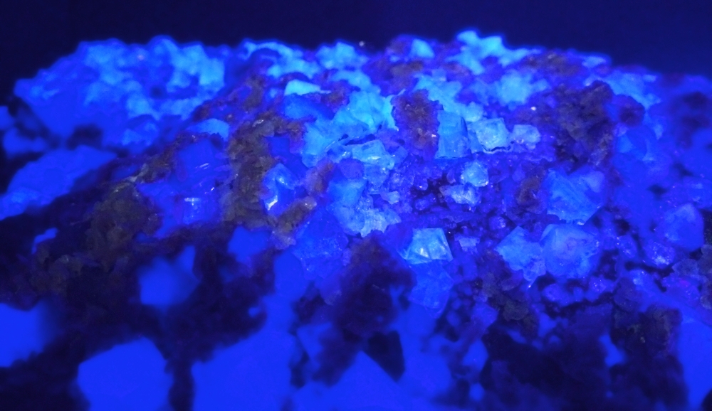 Fluorit mit Galenit und Siderit: Und noch mal mit UV-Licht: Fluorit mit Quarz überzogen: Hier noch mal ein Exemplar in weiß und lila. Leider hatte ich mir nicht notiert was das grüne war