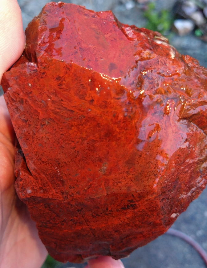 Ich habe mehrere rote Steine gefunden, von denen ich dachte, dass es roter Jaspis sei. Sie waren verdreckt und teilweise Moosig, so dass ich nicht mehr erkennen konnte. Als wir heute Abend Zuhause angekommen waren, habe ich den größten und am reinsten aussehenden Stein mal ordentlich gewaschen.