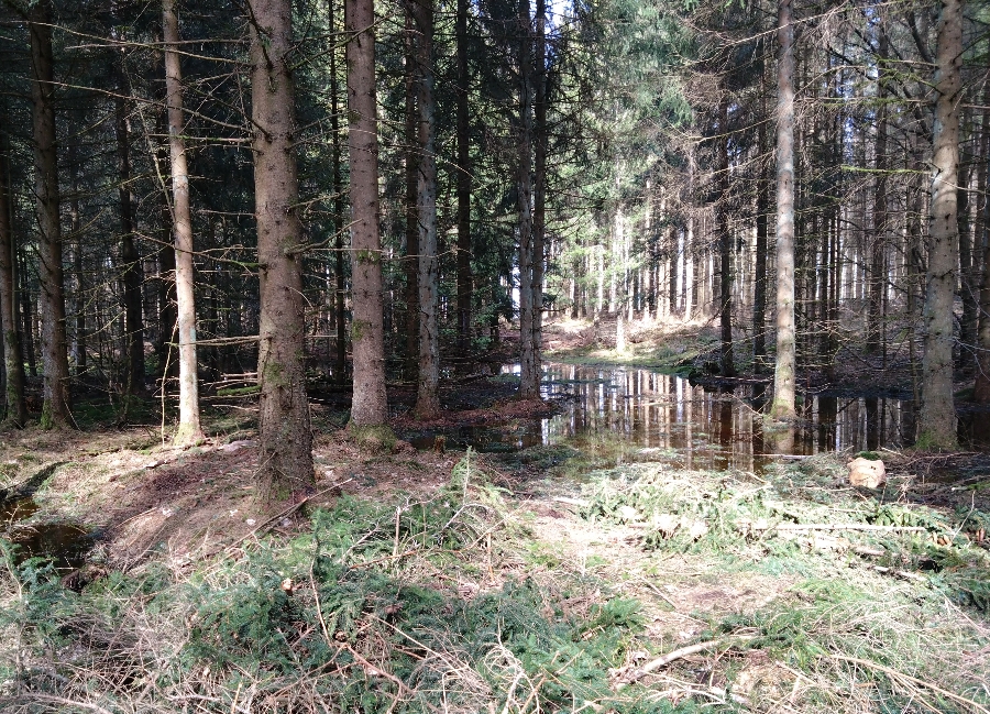 Im Anschluss haben wir noch einen Spaziergang im daneben liegenden Wald unternommen, welcher ebenfalls stellenweise nur über Stege zu bewältigen war. Auch wenn diese Bereich offiziell nicht mehr zum Moor gehörte, war der Boden doch sehr torflastig und ebenfalls sehr sumpfig, so dass man den Weg nicht verlassen sollte.