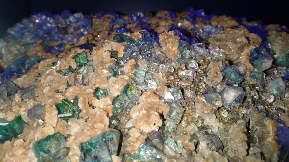 Ich zeige hier nur einen kleinen Teil der Mineralienausstellung, da diese in einem dunklen Teil liegen und nur punktuell beleuchtet werden. Zusammen mit einer Fettfinger verschmierten Scheibe, hat mein Handy vieles nicht fotografieren wollen.