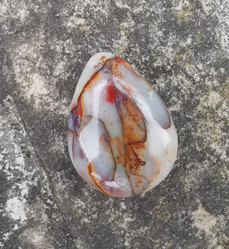 Ich würde sagen etwas achatiges. dendritisches. mit hämatit. läuft manchmal auch unter dem namen cracy lace agate, auch wenn man keine bänderung sieht.