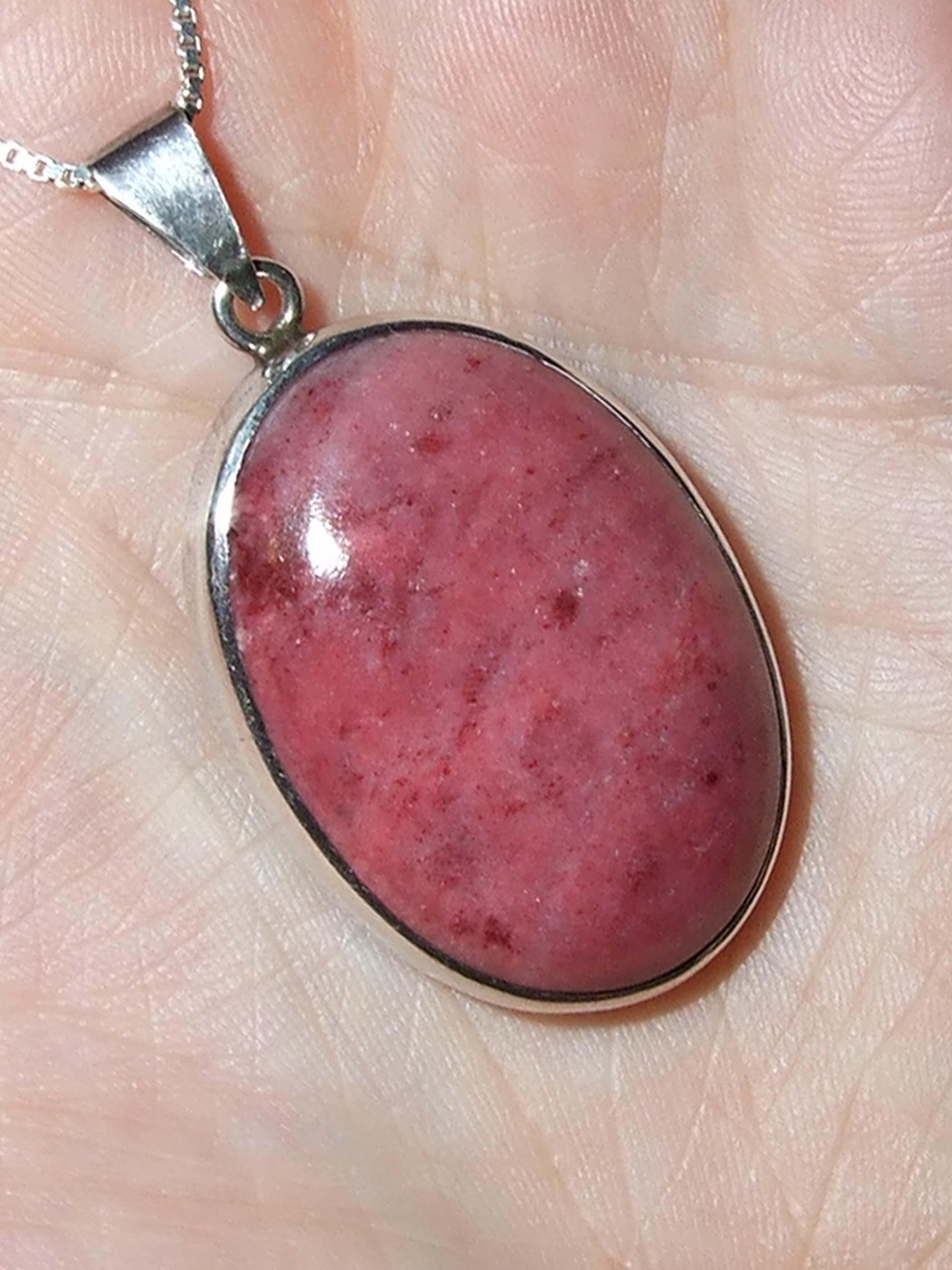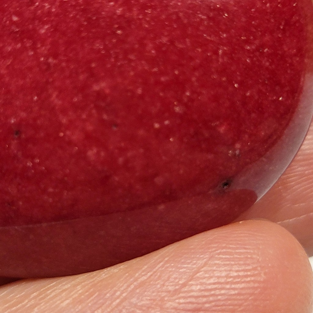Es zieht sich ein ganz leichter Glimmer durch die Cabochons. Und es scheinen hellere "Flecken" und Linien im Stein zu sein. Außerdem hat er winzige schwarze Stellen - durch das Vergrößerungsglas betrachtet sind das winzige Löcher. Die Oberfläche ist nicht ganz glatt, es sind feinste Risse zu erkennen. Die Cabochons sind opak.