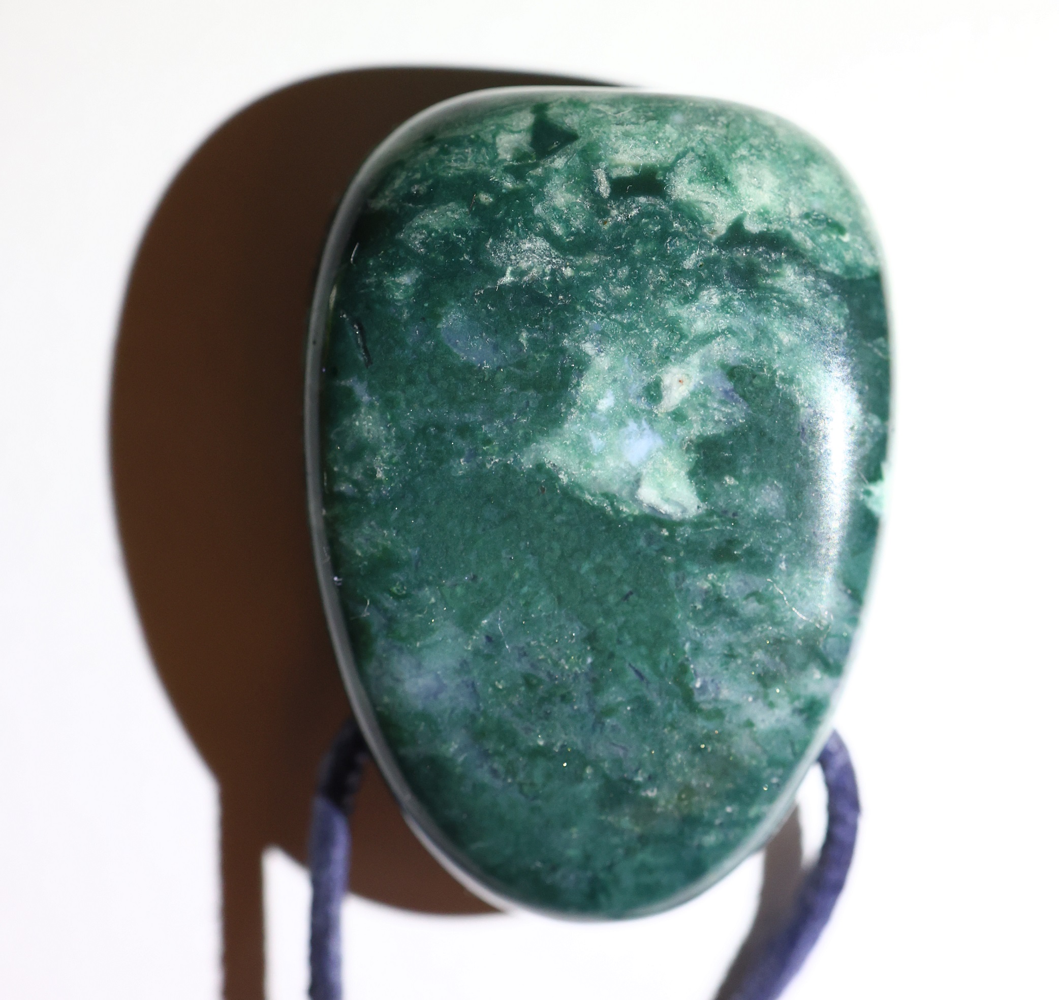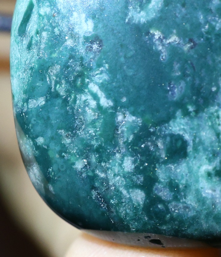 ich habe von einer lieben Freundin einen Stein geschenkt bekommen und frage mich, was es sein könnte. Er glitzert zart, wenn man ihn im Licht bewegt, ist dunkelgrün mit helleren Flecken und stellen, die klar sind (dort kann man ein kleines Stückchen in den Stein hineinblicken).