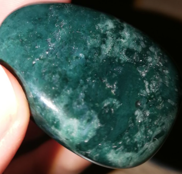 ich habe von einer lieben Freundin einen Stein geschenkt bekommen und frage mich, was es sein könnte. Er glitzert zart, wenn man ihn im Licht bewegt, ist dunkelgrün mit helleren Flecken und stellen, die klar sind (dort kann man ein kleines Stückchen in den Stein hineinblicken).