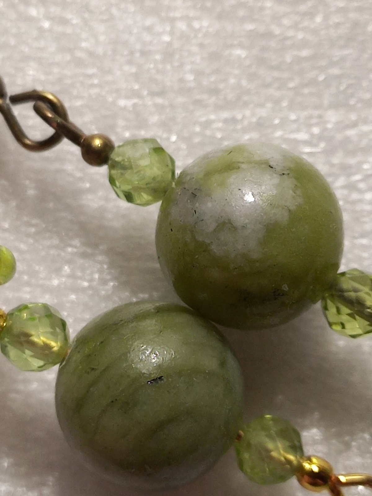 Vor einigen Jahren habe ich ein paar Stränge Edelsteinperlen als "Peridot" gekauft. Damals habe ich sie mir nicht so genau angeschaut, weil ich mit der Schmuckherstellung pausieren musste, und habe sie nur als sehr hässlich/minderwertig eingeschätzt. Als ich jetzt angefangen habe sie zu verarbeiten ist mir aufgefallen, dass nicht nur die Farbe sehr schlierig/streifig heller und dunkler grün ist, sondern einige Perlen auch weiße Stellen besitzen (vermutlich Quarz?) und mir kamen Zweifel.