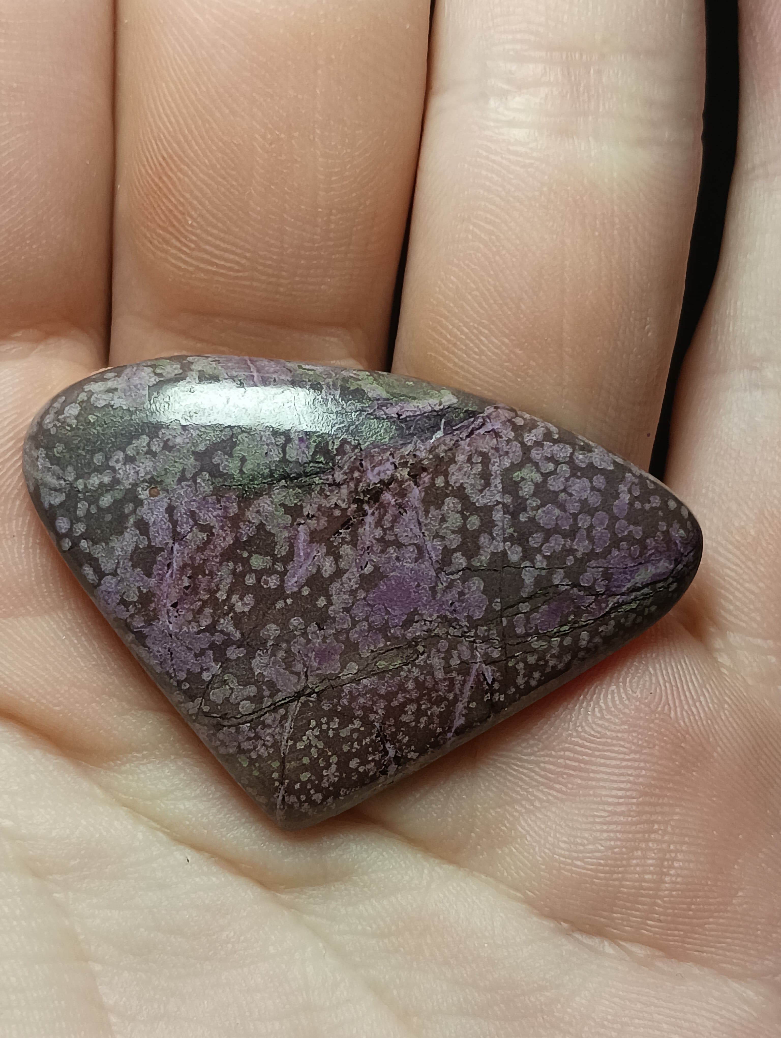 Er ist auberginefarben mit wildem Muster aus flieder, lila und grün, das in seiner Zeichnung fast an die Kulturen in einer Petri-Schale erinnert. Der Cabochon ist matt-glänzend und wirkt von der Haptik recht hart, er scheint mir auch Apatit zu ritzen (Mohshärte 5).