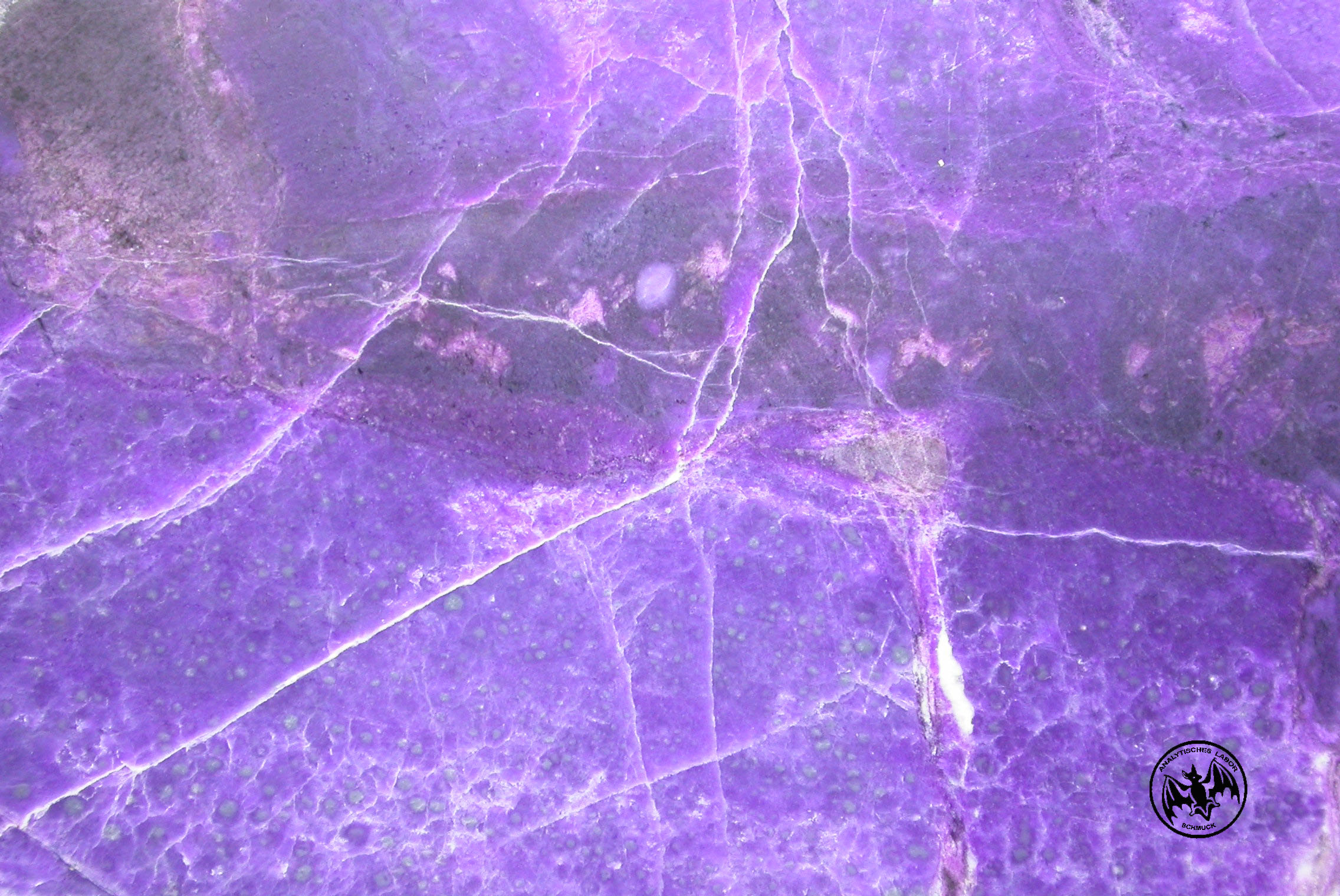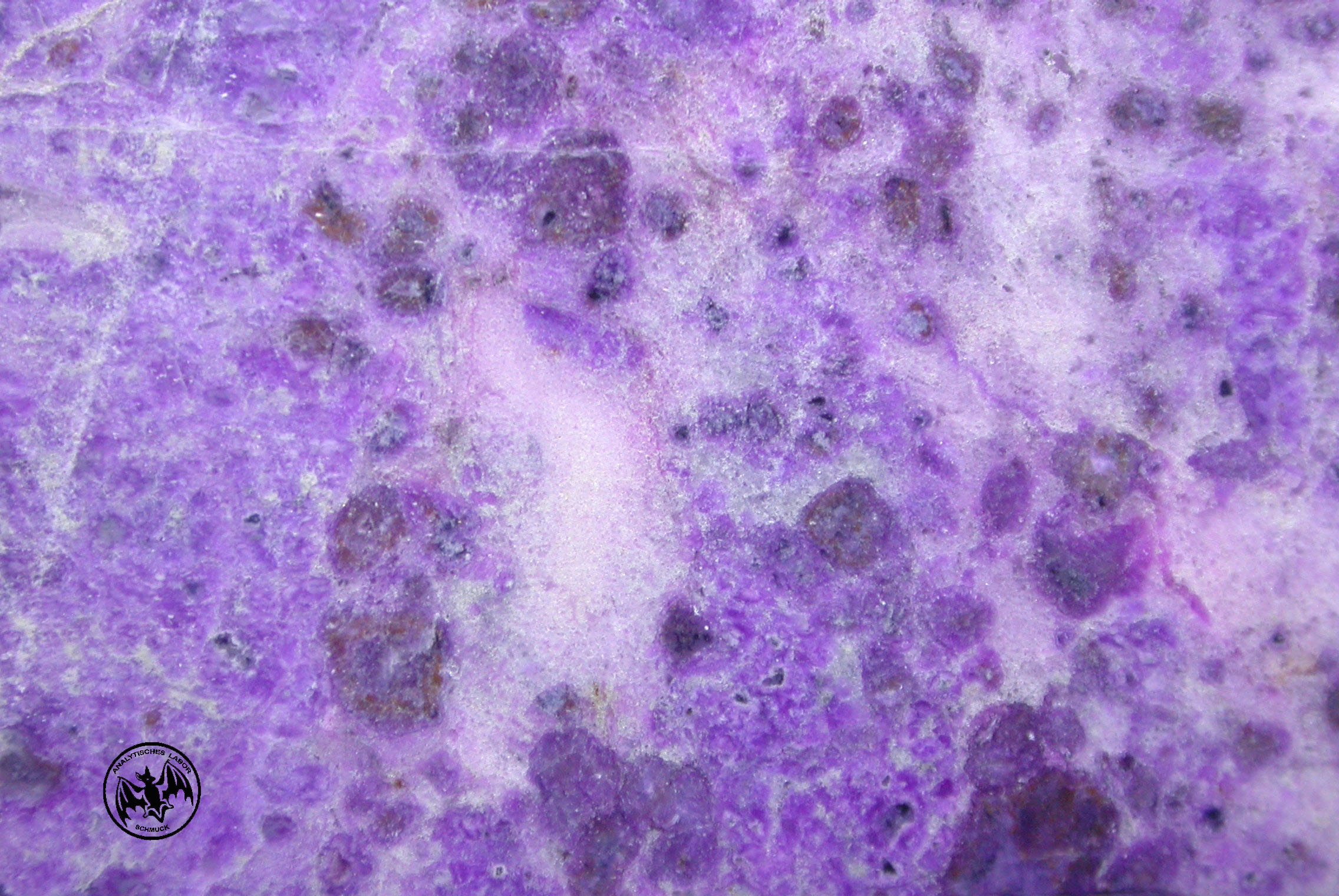 Wenn ich deinem Link folge, sehe ich auch hier einige Stücke mit diesem speziellen "Petrischalen-Muster" wie ich es nenne :lol: Sugilith kommt ja oft daher mit Beigesteinen wie Bustamit (alles was ins Rötliche geht) und Richterit (alles was ins Bläuliche geht). Vielleicht sind es Einschlüsse hiervon?