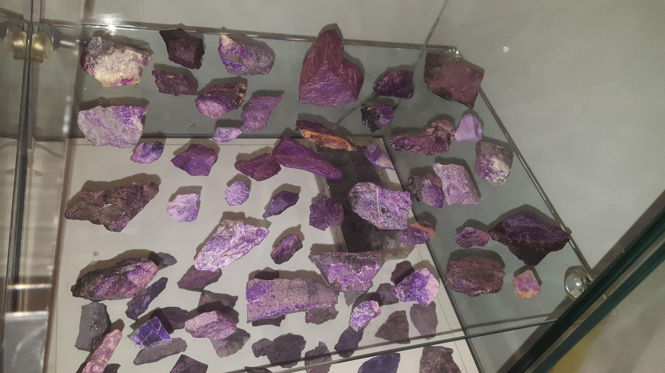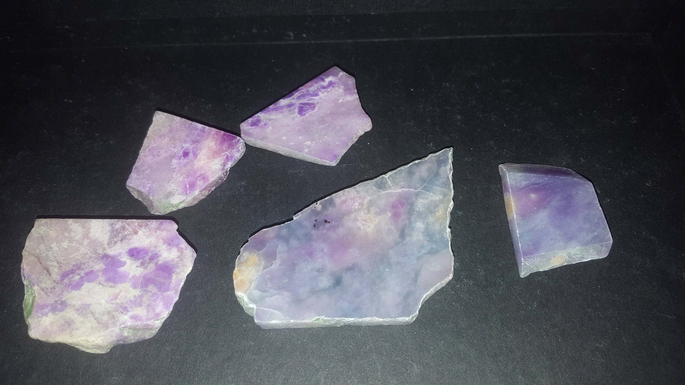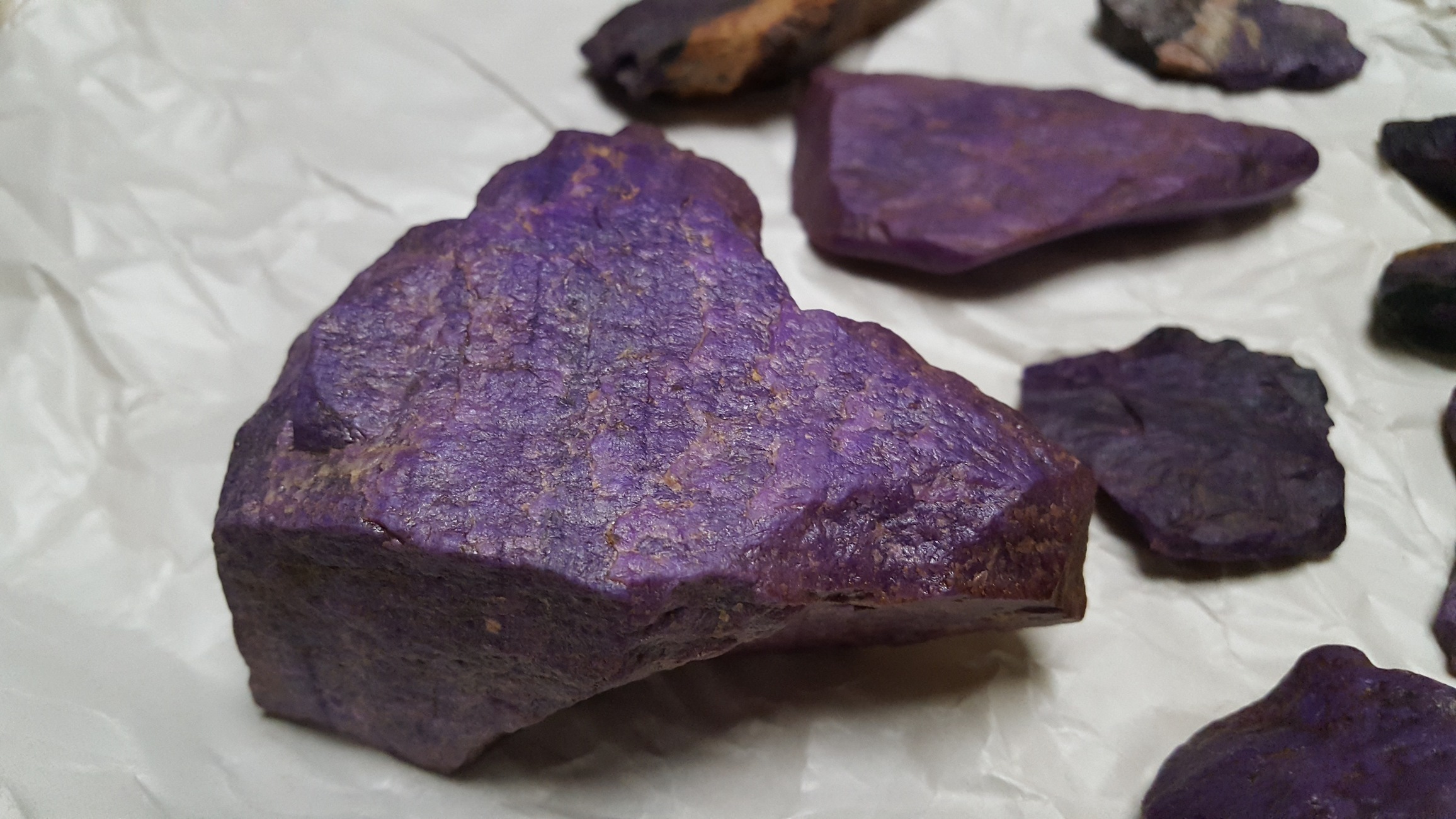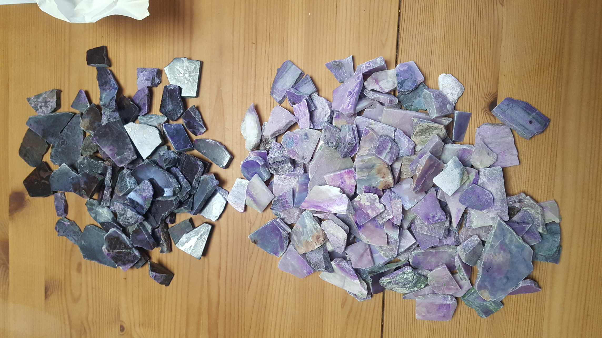 Eine Frage hätte ich noch. Wenn ich an deine Bilder heranzoome erkenne ich auch hier keinen Stein mit grünem Sugilithanteil. Hast du so einen grünen Sugilith-Anteil schon einmal in deiner Sammeltkarriere gesehen? Ich bin nämlich die ganze Zeit am hadern mit der Bestimmungsfrage. Serpentin in Stichtit (Atlantisit) habe ich Recht schnell aufgrund der Mohshärte ausgeschlossen. Aber da gibt es ja noch violetten Dumortierit, der oft Grünanteil hat und vor allem die violette Lavendeljade mit Grünanteil. Aber bei beidem finde ich nicht diese typische fleckige Zeichnung "+"+"