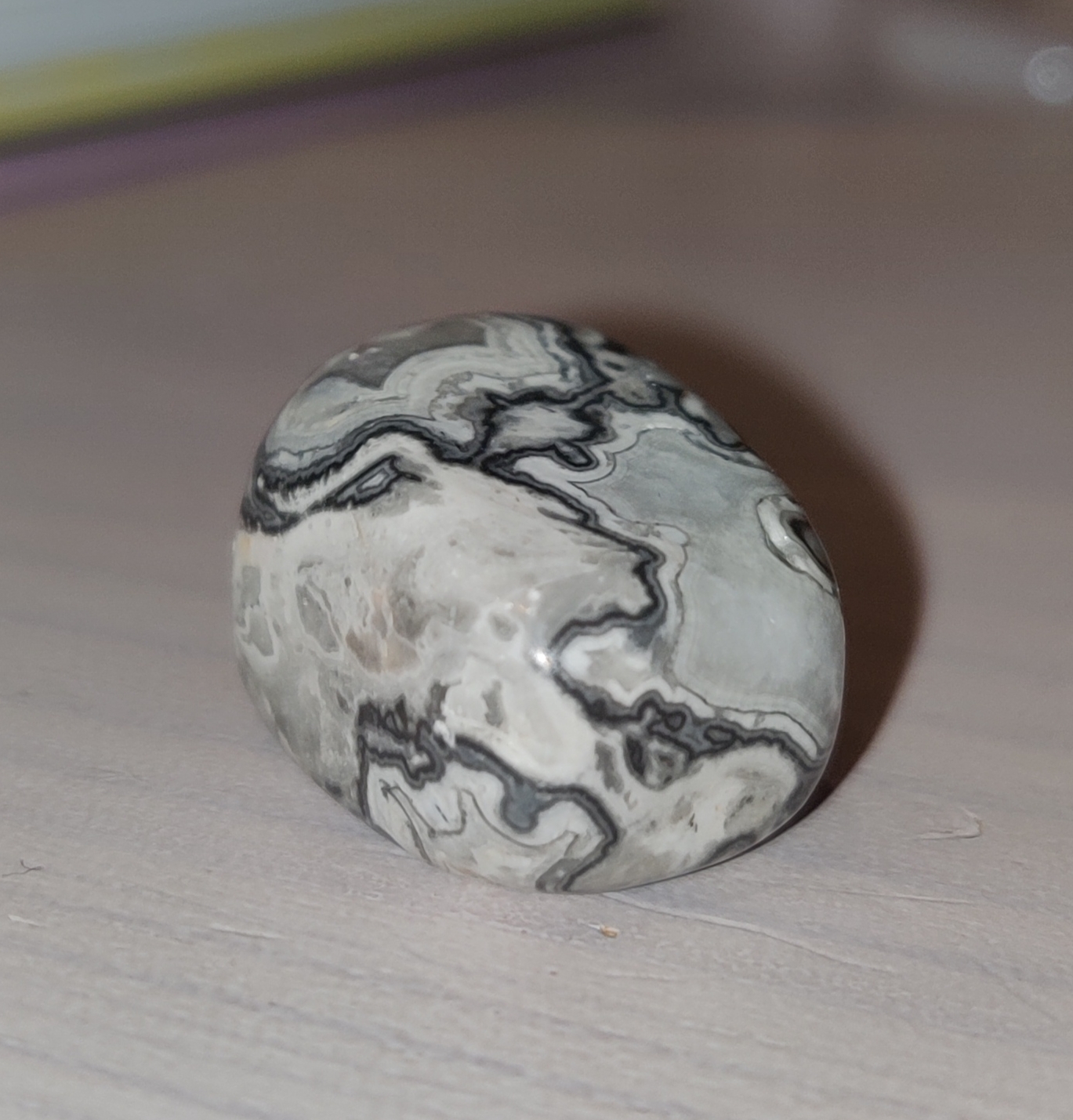 Grauer Crazy Lace Achat ist gut möglich....wobei da die Zeichnung oft kleinteiliger ist als der abgebildete Stein.