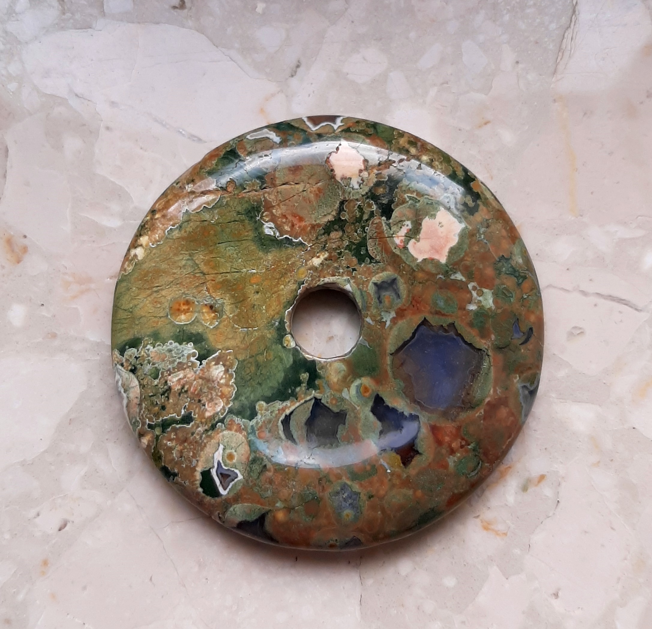 Hab mal Fotos von meinem großen Rhyolith Donut gemacht. Er ist knapp 6 cm im Durchmesser und wiegt 44 g.