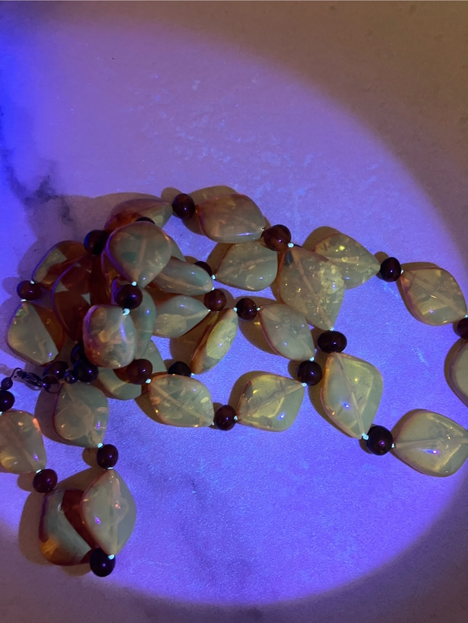 Ich habe gelesen, dass Bernstein unter UV Licht weiß/blau leuchtet. Da ich keinen Vergleich habe, kann ich anhand der Fotos nicht sagen, ob das jetzt schon ein weiß/blaues Leuchten ist