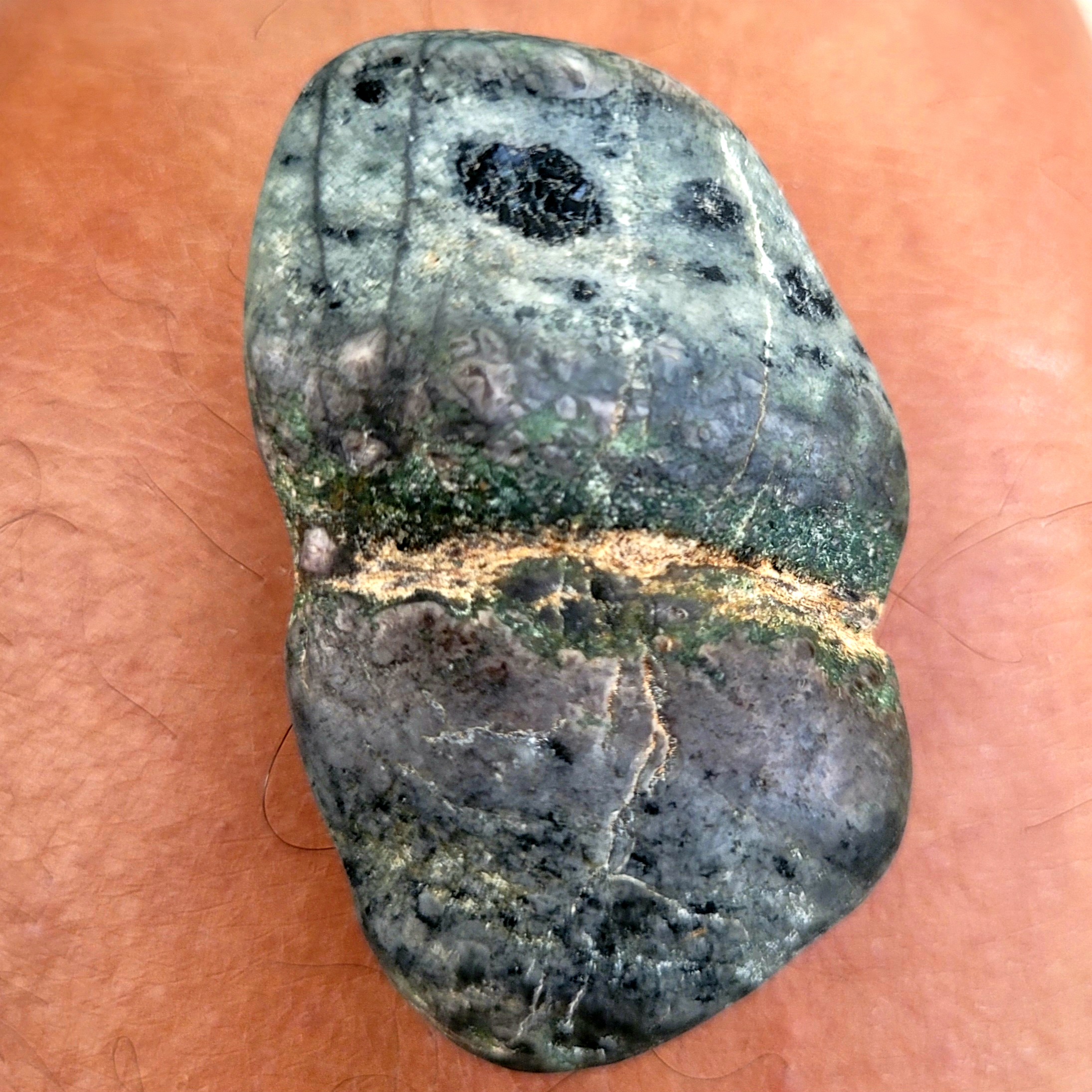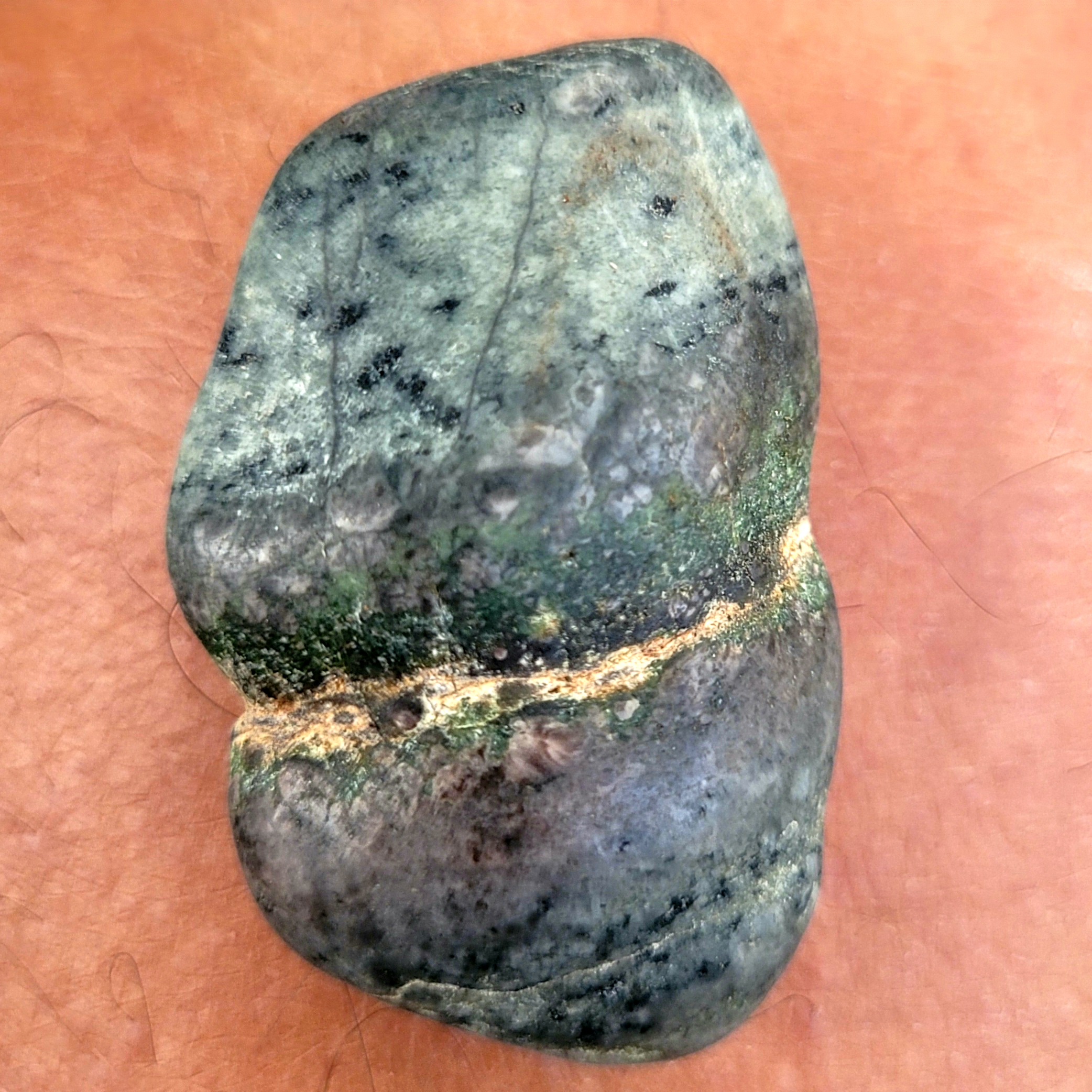 Ich bin nicht Ihrer Meinung zu dem außergewöhnlichen Stein.Nach meinen Recherchen sollte es ein Moosachat sein oder ein Grüner Jaspis