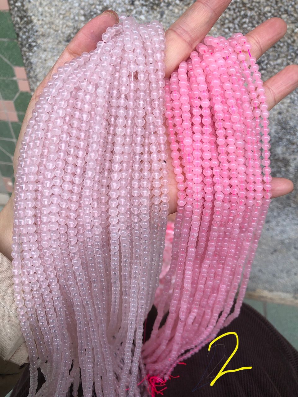 Hier ist links ein schon recht guter echter Rosenquarz zu sehen, der rechte dagegen ist farbverstärkt und zudem ist das Band im Innern sehr stark rosa. Beim echten zwas ist das band auch etwas rosa, jedoch nicht so stark.