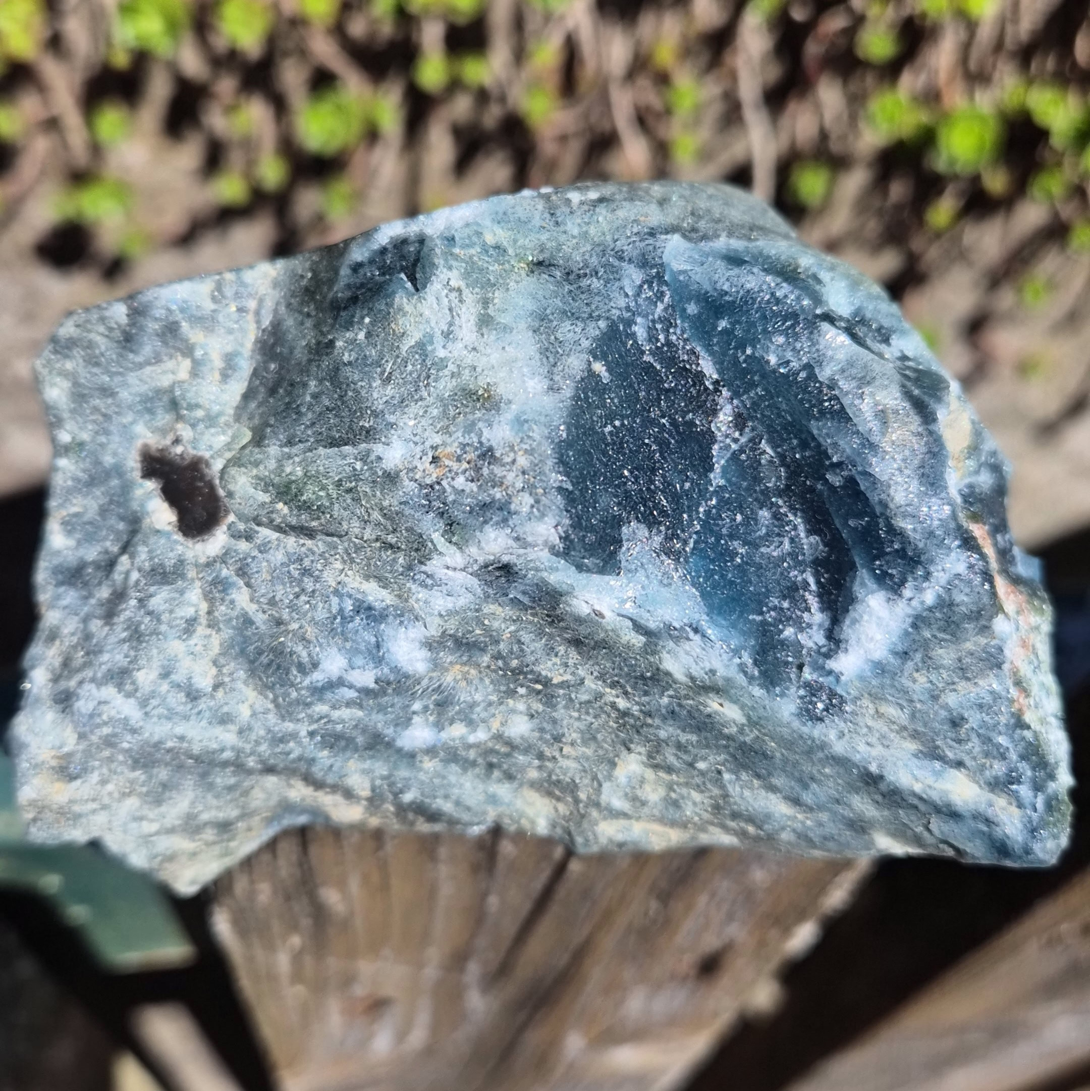 Blaue Schlacke mit kleinen Nadeln könnte sich auf "Bode-Achat" oder "Sieber-Achat" beziehen,