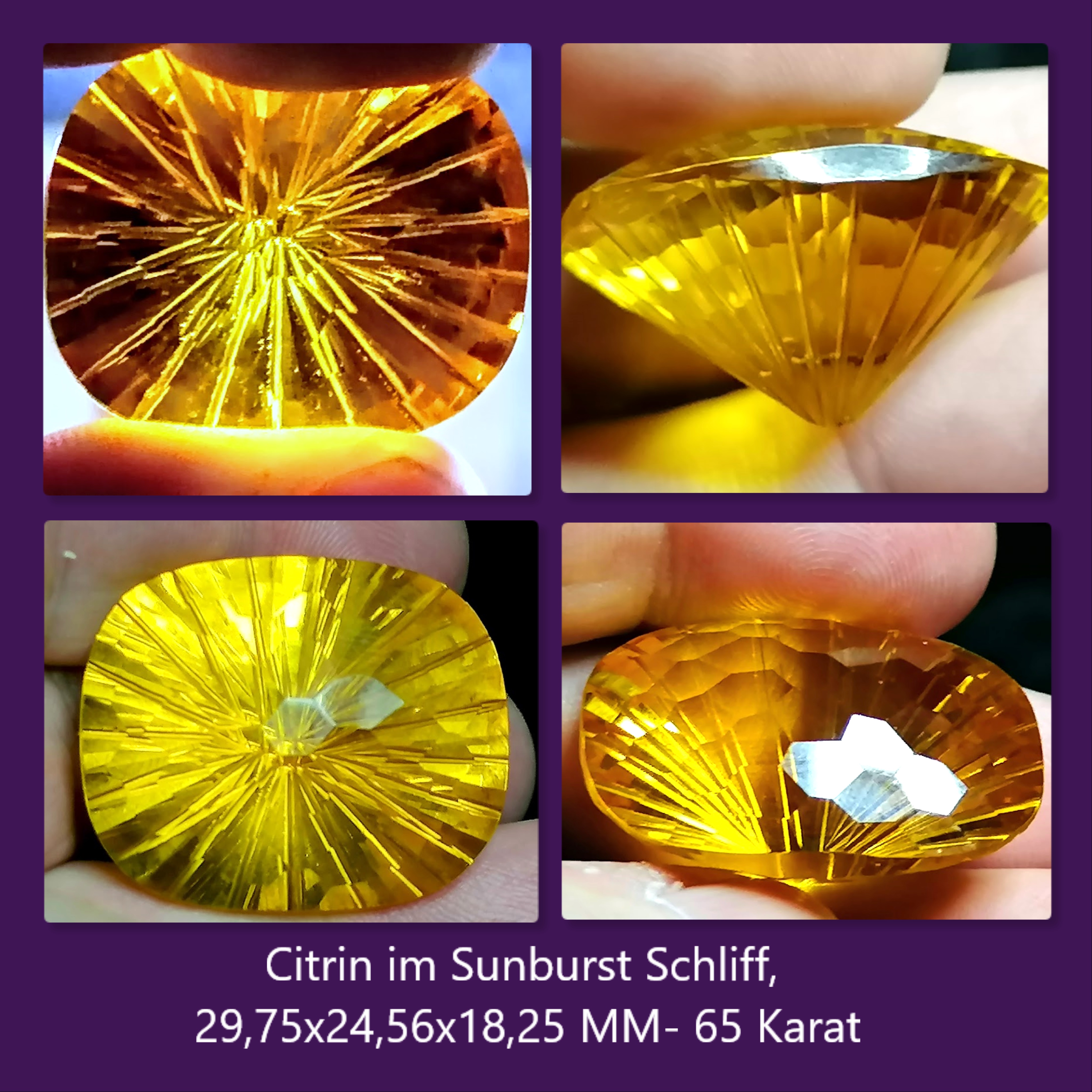 Da ich die Herkunftsminen aller Steine kenne und zum Verkäufer ein langjähriges Vertrauensverhältnis aufgebaut habe (er verkauft nicht nur Edelsteine, sondern vor allem auch Kristalle aller Sorten an Mineralogen und fachkundige Sammler in der ganzen Welt), kann ich mit gutem Gewissen sagen: Hier seht ihr, welche Farben qualitativ hochwertige Naturcitrine haben (können). Grösse der Steine: Die kleinsten (die beiden weissen Sternquarze und die kleinsten Citrine) wiegen rund 70 ct. Der grösste Citrin links unten wiegt 250 ct, also 50 g. Es sind alle lupenrein und entsprechend kostbar, aber in Relation zu anderen Edelsteinen in dieser Grösse natürlich „Schnäppchen“.